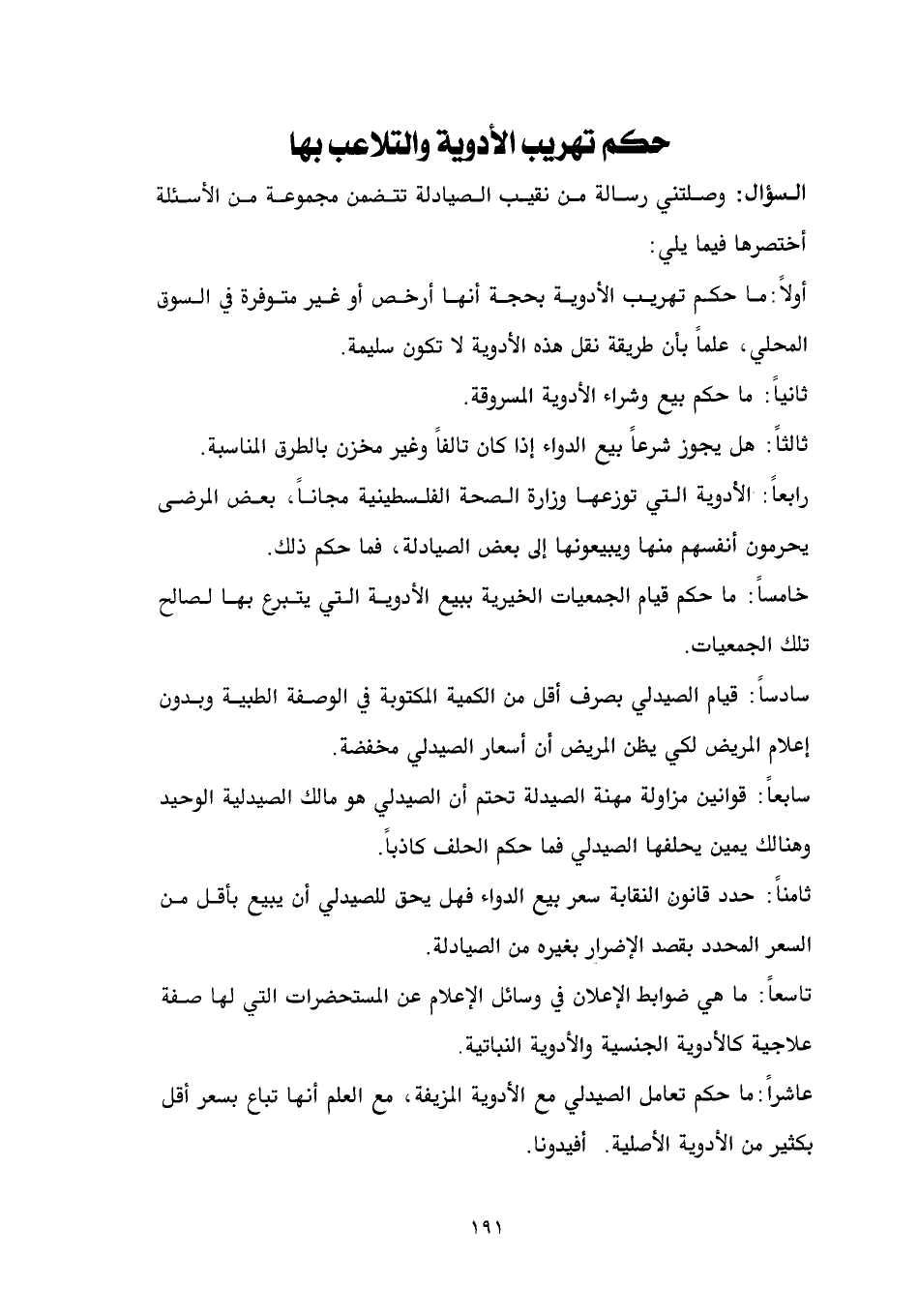 السؤال: وصلتني رسالة من نقيب الصيادلة تتضمن مجموعة من الأسئلة أختصرها فيما يلي: