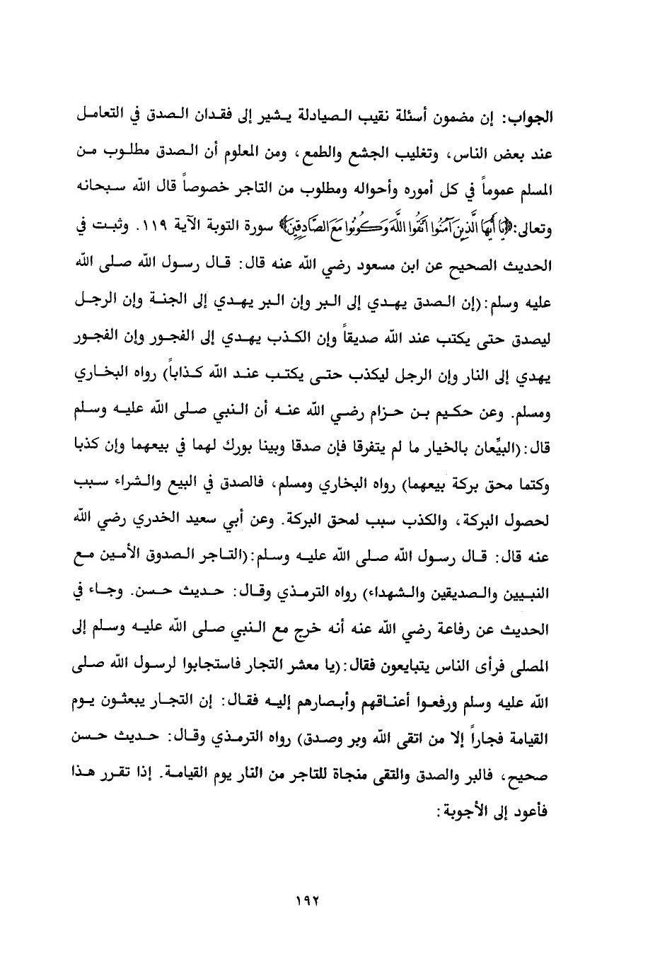 الجواب: إن مضمون أسئلة نقيب الصيادلة يشير إلى فقدان الصدق في التعامل عند بعض الناس، وتغليب الجشع والطمع، ومن المعلوم أن الصدق مطلوب من المسلم عموماً في كل أموره وأحواله ومطلوب من التاجر خصوصاً قال الله سبحانه وتعالى: {يَا أَيُّهَا الَّذِينَ آمَنُوا اتَّقُوا اللَّهَ وَكُونُوا مَعَ الصَّادِقِينَ} سورة التوبة الآية 119. وثبت في الحديث الصحيح عن ابن مسعود رضي الله عنه قال: قال رسول الله صلى الله عليه وسلم: (إن الصدق يهدي إلى البر وإن البر يهدي إلى الجنة وإن الرجل ليصدق حتى يكتب عند الله صديقاً وإن الكذب يهدي إلى الفجور وإن الفجور يهدي إلى النار وإن الرجل ليكذب حتى يكتب عند الله كذاباً) رواه البخاري ومسلم. وعن حكيم بن حزام رضي الله عنه أن النبي صلى الله عليه وسلم قال: (البيِّعان بالخيار ما لم يتفرقا فإن صدقا وبينا بورك لهما في بيعهما وإن كذبا وكتما محق بركة بيعهما) رواه البخاري ومسلم، فالصدق في البيع والشراء سبب لحصول البركة، والكذب سبب لمحق البركة. وعن أبي سعيد الخدري رضي الله عنه قال: قال رسول الله صلى الله عليه وسلم: (التاجر الصدوق الأمين مع النبيين والصديقين والشهداء) رواه الترمذي وقال: حديث حسن. وجاء في الحديث عن رفاعة رضي الله عنه أنه خرج مع النبي صلى الله عليه وسلم إلى المصلى فرأى الناس يتبايعون فقال: (يا معشر التجار فاستجابوا لرسول الله صلى الله عليه وسلم ورفعوا أعناقهم وأبصارهم إليه فقال: إن التجار يبعثون يوم القيامة فجاراً إلا من اتقى الله وبر وصدق) رواه الترمذي وقال: حديث حسن صحيح، فالبر والصدق والتقى منجاة للتاجر من النار يوم القيامة. إذا تقرر هذا فأعود إلى الأجوبة:
