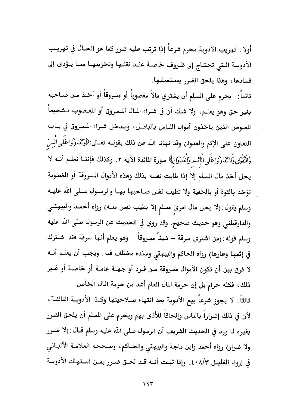ثالثاً: لا يجوز شرعاً بيع الأدوية بعد انتهاء صلاحيتها وكذا الأدوية التالفة، لأن في ذلك إضراراً بالناس وإلحاقاً للأذى بهم ويحرم على المسلم أن يلحق الضرر بغيره لما ورد في الحديث الشريف أن الرسول صلى الله عليه وسلم قال: (لا ضرر ولا ضرار) رواه أحمد وابن ماجة والبيهقي والحاكم، وصححه العلامة الألباني في إرواء الغليل 3/ 408. وإذا ثبت أنه قد لحق ضرر بمن استهلك الأدوية