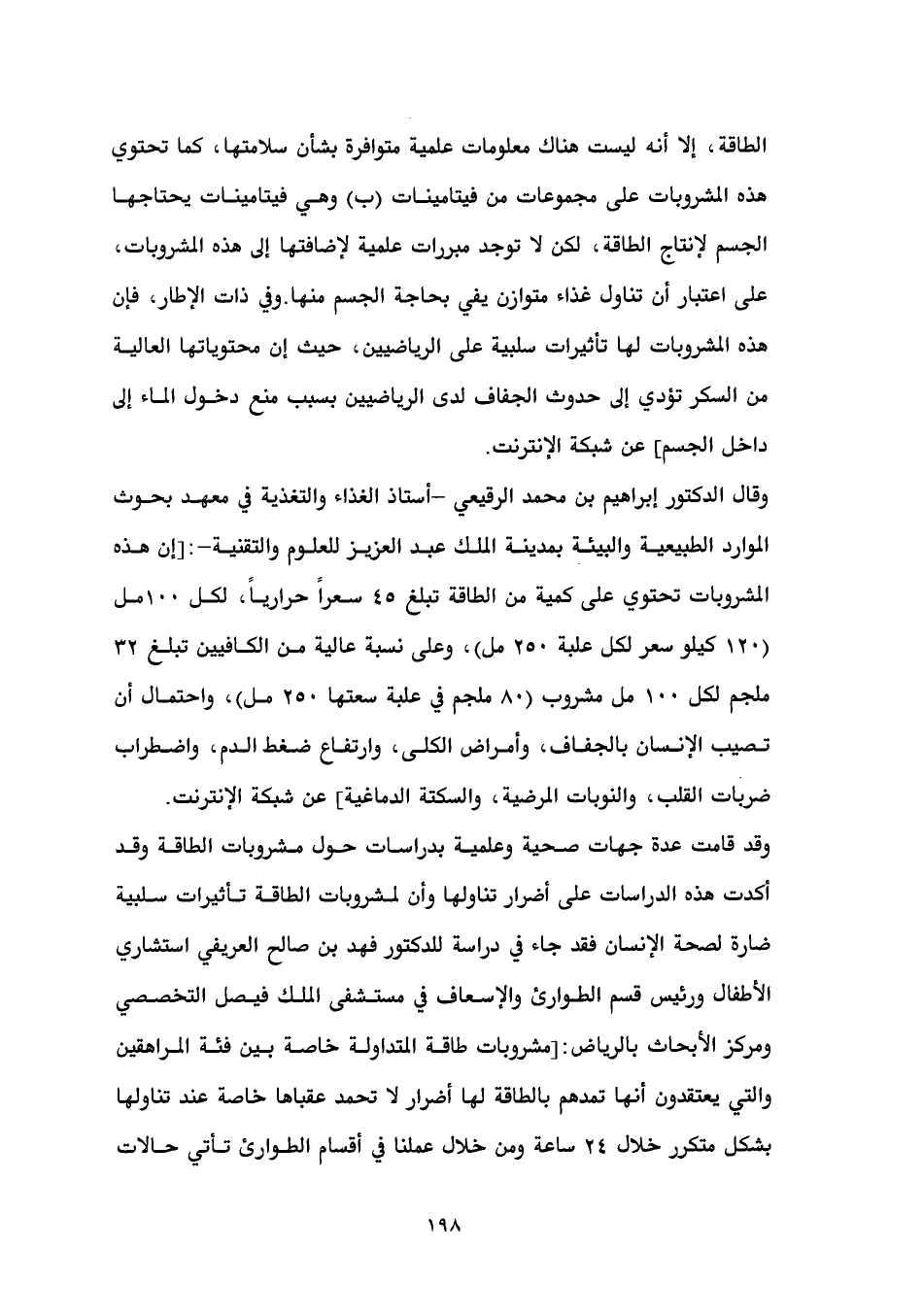 وقال الدكتور إبراهيم بن محمد الرقيعي -أستاذ الغذاء والتغذية في معهد بحوث الموارد الطبيعية والبيئة بمدينة الملك عبد العزيز للعلوم والتقنية-: [إن هذه المشروبات تحتوي على كمية من الطاقة تبلغ 45 سعراً حرارياً، لكل 100مل (120 كيلو سعر لكل علبة 250 مل)، وعلى نسبة عالية من الكافيين تبلغ 32 ملجم لكل 100 مل مشروب (80 ملجم في علبة سعتها 250 مل)، واحتمال أن تصيب الإنسان