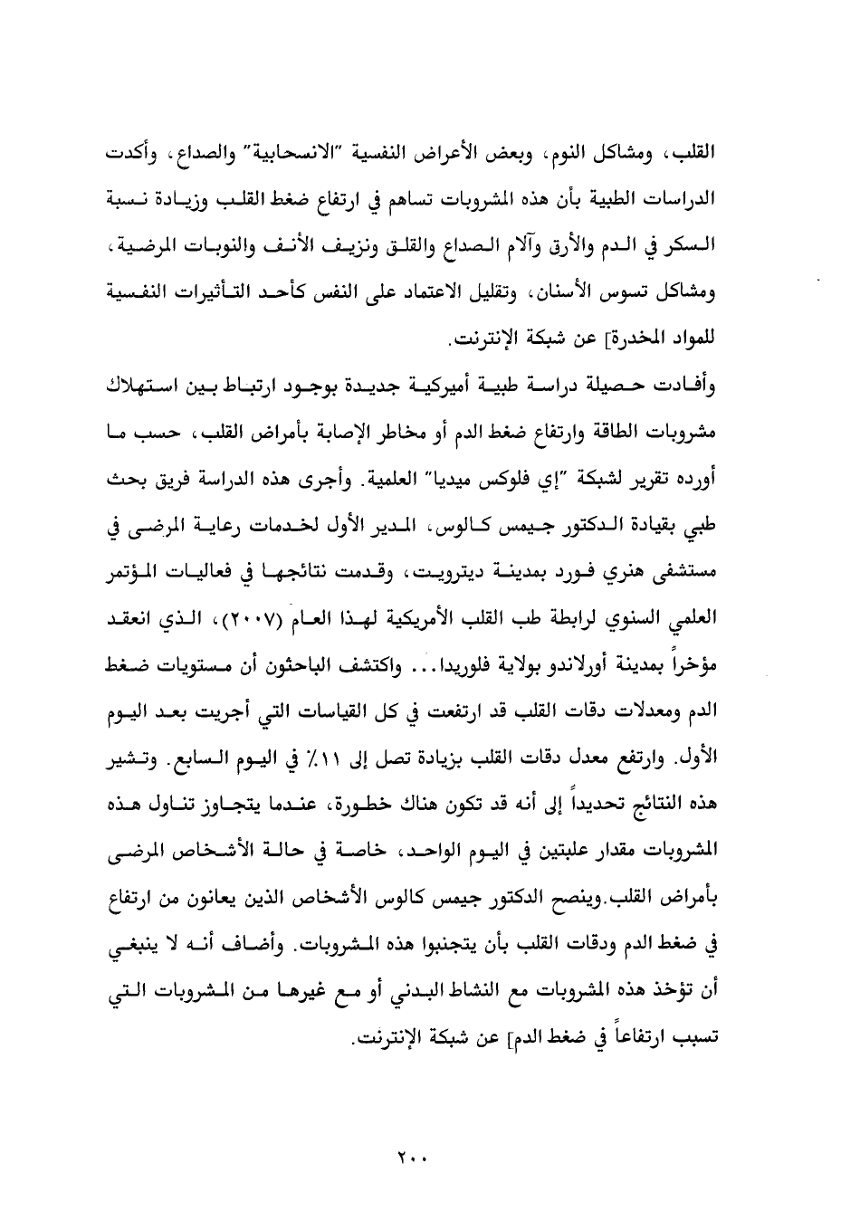 وأفادت حصيلة دراسة طبية أميركية جديدة بوجود ارتباط بين استهلاك مشروبات الطاقة وارتفاع ضغط الدم أو مخاطر الإصابة بأمراض القلب، حسب ما أورده تقرير لشبكة "إي فلوكس ميديا" العلمية. وأجرى هذه الدراسة فريق بحث طبي بقيادة الدكتور جيمس كالوس، المدير الأول لخدمات رعاية المرضى في مستشفى هنري فورد بمدينة ديترويت، وقدمت نتائجها في فعاليات المؤتمر العلمي السنوي لرابطة طب القلب الأمريكية لهذا العام (2007)، الذي انعقد مؤخراً بمدينة أورلاندو بولاية فلوريدا ... واكتشف الباحثون أن مستويات ضغط الدم ومعدلات دقات القلب قد ارتفعت في كل القياسات التي أجريت بعد اليوم الأول. وارتفع معدل دقات القلب بزيادة تصل إلى 11% في اليوم السابع. وتشير هذه النتائج تحديداً إلى أنه قد تكون