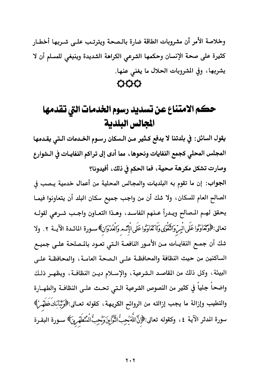 الجواب: إن ما تقوم به البلديات والمجالس المحلية من أعمال خدمية يصب في الصالح العام للسكان، ولا شك أن من واجب جميع سكان البلد أن يتعاونوا فيما يحقق لهم المصالح ويدرأ عنهم المفاسد، وهذا التعاون واجب شرعي لقوله تعالى: {وَتَعَاوَنُوا عَلَى الْبِرِّ وَالتَّقْوَى وَلَا تَعَاوَنُوا عَلَى الْإِثْمِ وَالْعُدْوَانِ} سورة المائدة الآية 2. ولا شك أن جمع النفايات من الأمور النافعة التي تعود بالمصلحة على جميع الساكنين من حيث النظافة والمحافظة على الصحة العامة، والمحافظة على البيئة، وكل ذلك من المقاصد الشرعية، والإسلام دين النظافة، ويظهر ذلك واضحاً جلياً في كثير من النصوص الشرعية التي تحث على النظافة والطهارة والتطيب وإزالة ما يجب إزالته من الروائح الكريهة، كقوله تعالى: {وَثِيَابَكَ فَطَهِّرْ} سورة المدثر الآية 4، وكقوله تعالى: {إِنَّ اللَّهَ يُحِبُّ التَّوَّابِينَ وَيُحِبُّ الْمُتَطَهِّرِينَ} سورة البقرة