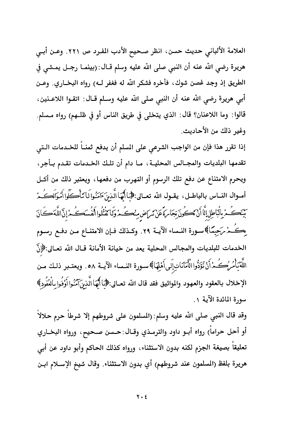 الناس بالباطل، يقول الله تعالى: {يَا أَيُّهَا الَّذِينَءَامَنُوا لَا تَأْكُلُوا أَمْوَالَكُمْ بَيْنَكُمْ بِالْبَاطِلِ إِلَّا أَنْ تَكُونَ تِجَارَةً عَنْ تَرَاضٍ مِنْكُمْ وَلَا تَقْتُلُوا أَنْفُسَكُمْ إِنَّ اللَّهَ كَانَ بِكُمْ رَحِيمًا} سورة النساء الآية 29. وكذلك فإن الامتناع من دفع رسوم الخدمات للبلديات والمجالس المحلية يعد من خيانة الأمانة قال الله تعالى: {إِنَّ اللَّهَ يَأْمُرُكُمْ أَنْ تُؤَدُّوا الْأَمَانَاتِ إِلَى أَهْلِهَا} سورة النساء الآية 58. ويعتبر ذلك من الإخلال بالعقود والعهود والمواثيق فقد قال الله تعالى: {يَا أَيُّهَا الَّذِينَ آمَنُوا أَوْفُوا بِالْعُقُودِ} سورة المائدة الآية 1.