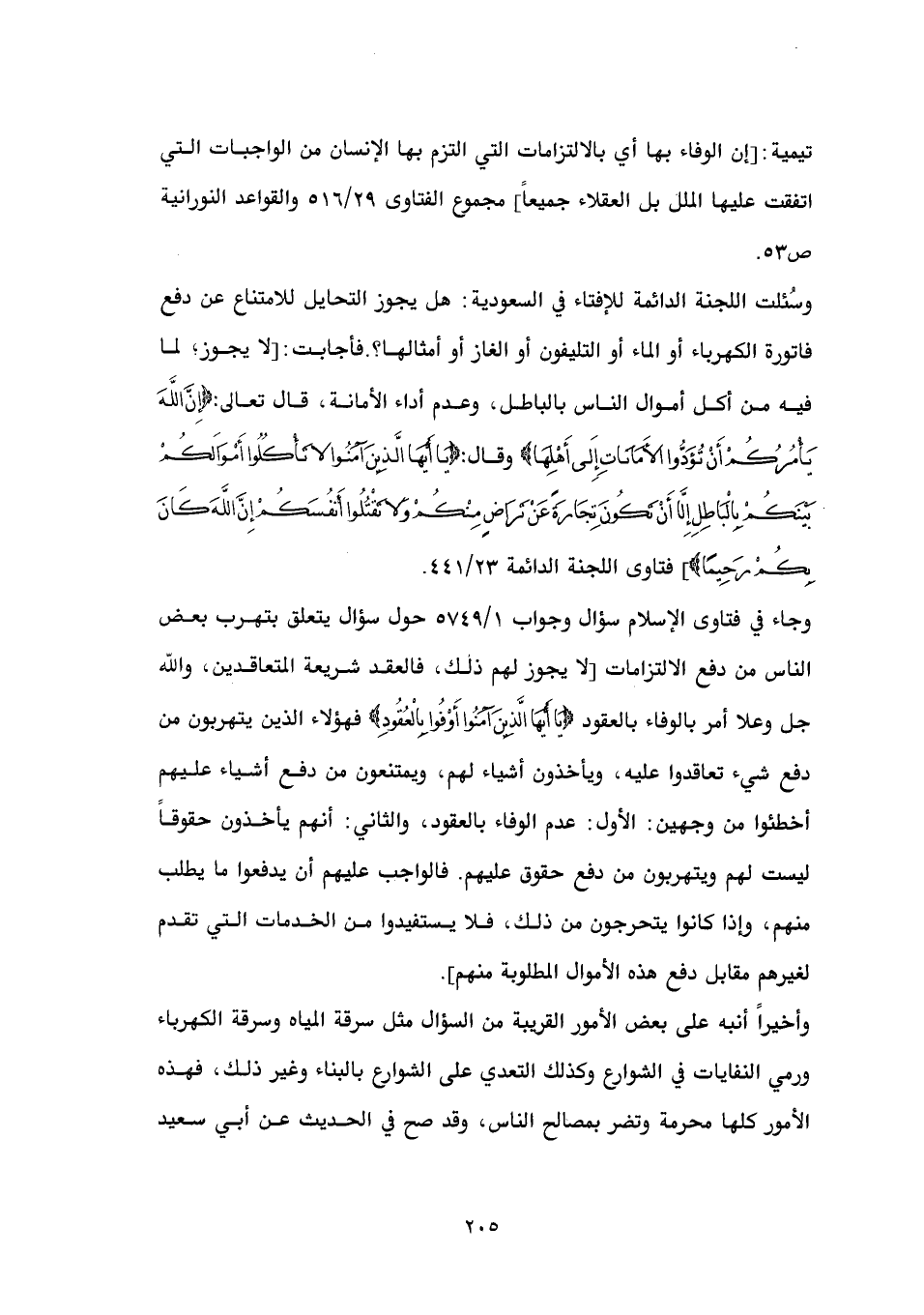 تيمية: [إن الوفاء بها أي بالالتزامات التي التزم بها الإنسان من الواجبات التي اتفقت عليها الملل بل العقلاء جميعاً] مجموع الفتاوى 29/ 516 والقواعد النورانية ص53.