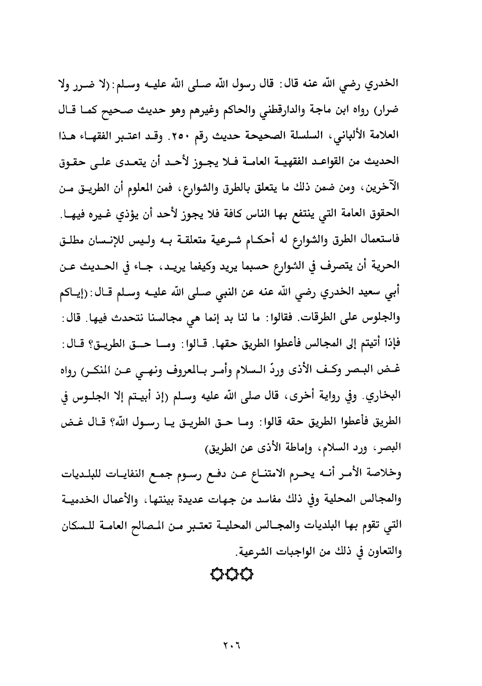 الخدري رضي الله عنه قال: قال رسول الله صلى الله عليه وسلم: (لا ضرر ولا ضرار) رواه ابن ماجة والدارقطني والحاكم وغيرهم وهو حديث صحيح كما قال العلامة الألباني، السلسلة الصحيحة حديث رقم 250. وقد اعتبر الفقهاء هذا الحديث من القواعد الفقهية العامة فلا يجوز لأحد أن يتعدى على حقوق الآخرين، ومن ضمن ذلك ما يتعلق بالطرق والشوارع، فمن المعلوم أن الطريق من الحقوق العامة التي ينتفع بها الناس كافة فلا يجوز لأحد أن يؤذي غيره فيها. فاستعمال الطرق والشوارع له أحكام شرعية متعلقة به وليس للإنسان مطلق الحرية أن يتصرف في الشوارع حسبما يريد وكيفما يريد، جاء في الحديث عن أبي سعيد الخدري رضي الله عنه عن النبي صلى الله عليه وسلم قال: (إياكم والجلوس على الطرقات. فقالوا: ما لنا بد إنما هي مجالسنا نتحدث فيها. قال: فإذا أتيتم إلى المجالس فأعطوا الطريق حقها. قالوا: وما حق الطريق؟ قال: غض البصر وكف الأذى وردّ السلام وأمر بالمعروف ونهي عن المنكر) رواه البخاري. وفي رواية أخرى، قال صلى الله عليه وسلم (إذ أبيتم إلا الجلوس في الطريق فأعطوا الطريق حقه قالوا: وما حق الطريق يا رسول الله؟ قال غض البصر، ورد السلام، وإماطة الأذى عن الطريق)