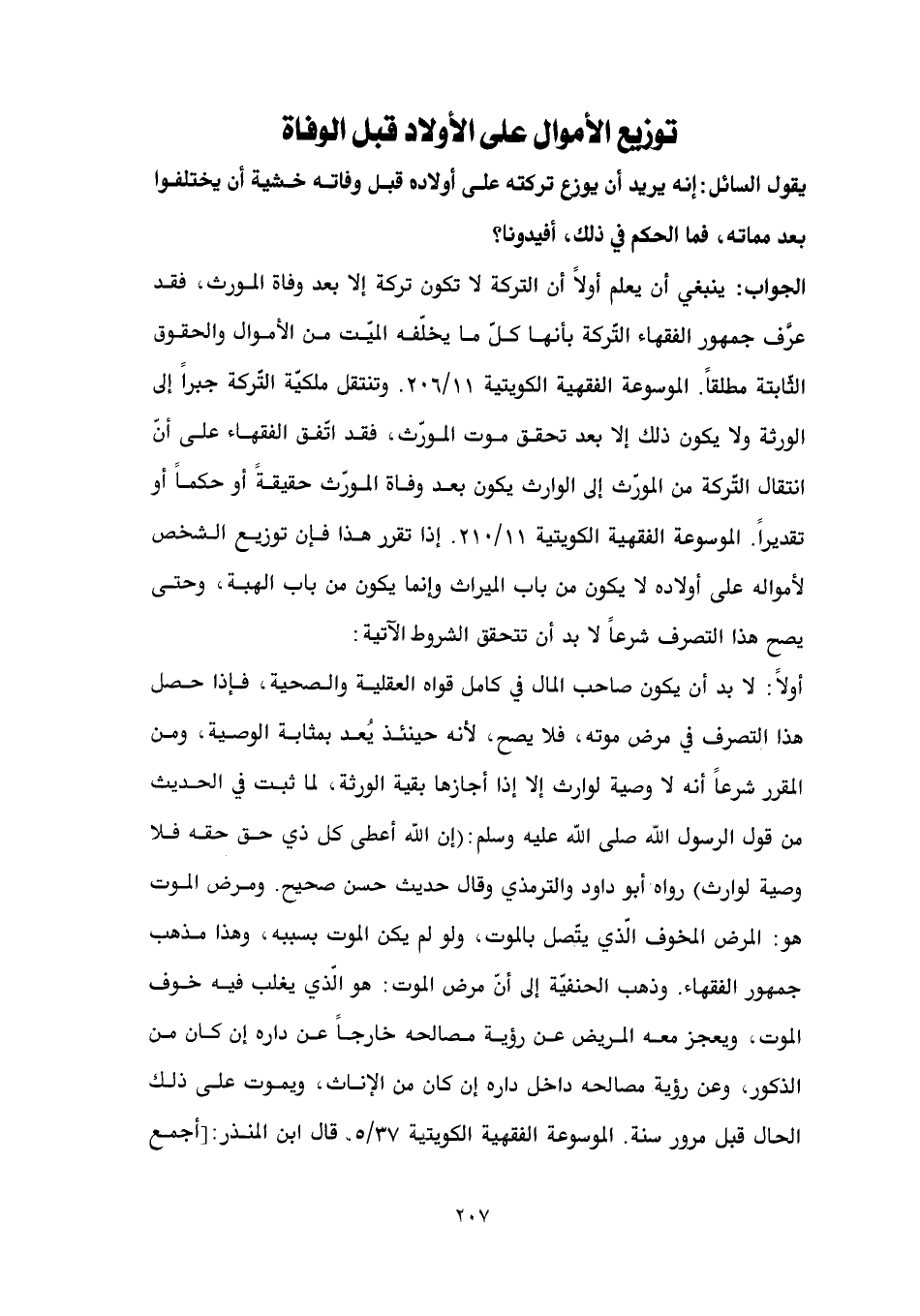 الجواب: ينبغي أن يعلم أولاً أن التركة لا تكون تركة إلا بعد وفاة المورث، فقد عرَّف جمهور الفقهاء التّركة بأنها كلّ ما يخلّفه الميّت من الأموال والحقوق الثّابتة مطلقاً. الموسوعة الفقهية الكويتية 11/ 206. وتنتقل ملكيّة التّركة جبراً إلى الورثة ولا يكون ذلك إلا بعد تحقق موت المورّث، فقد اتّفق الفقهاء على أنّ انتقال التّركة من المورّث إلى الوارث يكون بعد وفاة المورّث حقيقةً أو حكماً أو تقديراً. الموسوعة الفقهية الكويتية 11/ 210. إذا تقرر هذا فإن توزيع الشخص لأمواله على أولاده لا يكون من باب الميراث وإنما يكون من باب الهبة، وحتى يصح هذا التصرف شرعاً لا بد أن تتحقق الشروط الآتية: