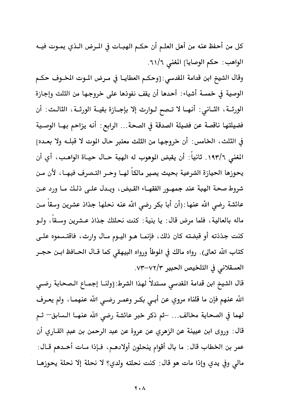 كل من أحفظ عنه من أهل العلم أن حكم الهبات في المرض الذي يموت فيه الواهب: حكم الوصايا] المغني 6/ 61. وقال الشيخ ابن قدامة المقدسي: [وحكم العطايا في مرض الموت المخوف حكم الوصية في خمسة أشياء: أحدها أن يقف نفوذها على خروجها من الثلث وإجازة الورثة، الثاني: أنها لا تصح لوارث إلا بإجازة بقية الورثة، الثالث: أن فضيلتها ناقصة عن فضيلة الصدقة في الصحة ... الرابع: أنه يزاحم بها الوصية في الثلث، الخامس: أن خروجها من الثلث معتبر حال الموت لا قبله ولا بعده.] المغني 6/ 193. ثانياً: أن يقبض الموهوب له الهبة حال حياة الواهب، أي أن يحوزها الحيازة الشرعية بحيث يصير مالكاً لها وحر التصرف فيها، لأن من شروط صحة الهبة عند جمهور الفقهاء القبض، ويدل على ذلك ما ورد عن عائشة رضي الله عنها: (أن أبا بكر رضي الله عنه نحلها جذاذ عشرين وسقاً من ماله بالعالية، فلما مرض قال: يا بنية: كنت نحلتك جذاذ عشرين وسقاً، ولو كنت جذذته أو قبضته كان ذلك، فإنما هو اليوم مال وارث، فاقتسموه على كتاب الله تعالى). رواه مالك في الموطأ ورواه البيهقي كما قال الحافظ ابن حجر العسقلاني في التلخيص الحبير 3/ 72 - 73.