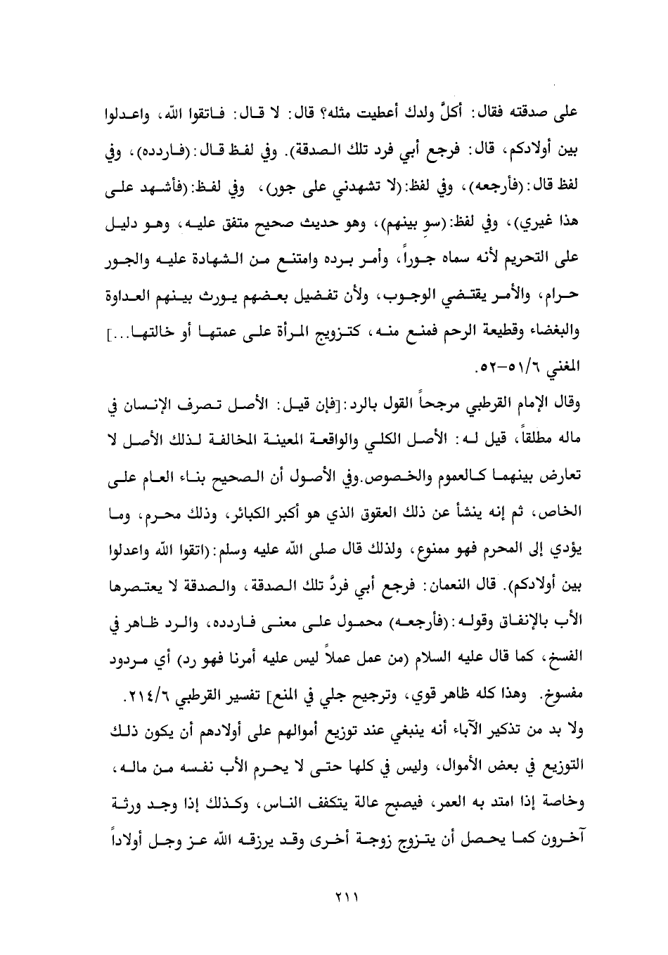 لفظ: (فأشهد على هذا غيري) وفي لفظ: (سوِ بينهم) وهو حديث صحيح متفق عليه، وهو دليل على التحريم لأنه سماه جورا ً، وأمر برده وامتنع من الشهادة عليه والجور حرام، والأمر يقتضي الوجوب، ولأن تفضيل بعضهم يورث بينهم العداوة والبغضاء وقطيعة الرحم فمنع منه، كتزويج المرأة على عمتها أو خالتها ... ] المغني 6/ 51 - 52. وقال الإمام القرطبي مرجحاً القول بالرد: [فإن قيل: الأصل تصرف الإنسان في ماله مطلقاً، قيل له: الأصل الكلي والواقعة المعينة المخالفة لذلك الأصل لا تعارض بينهما كالعموم والخصوص. وفي الأصول أن الصحيح بناء العام على الخاص، ثم إنه ينشأ عن ذلك العقوق الذي هو أكبر الكبائر، وذلك محرم، وما يؤدي إلى المحرم فهو ممنوع، ولذلك قال صلى الله عليه وسلم: (اتقوا الله واعدلوا بين أولادكم). قال النعمان: فرجع أبي فردَّ تلك الصدقة، والصدقة لا يعتصرها الأب بالإنفاق وقوله: (فأرجعه) محمول على معنى فاردده، والرد ظاهر في الفسخ، كما قال عليه السلام (من عمل عملاً ليس عليه أمرنا فهو رد) أي مردود مفسوخ. وهذا كله ظاهر قوي، وترجيح جلي في المنع] تفسير القرطبي 6/ 214.