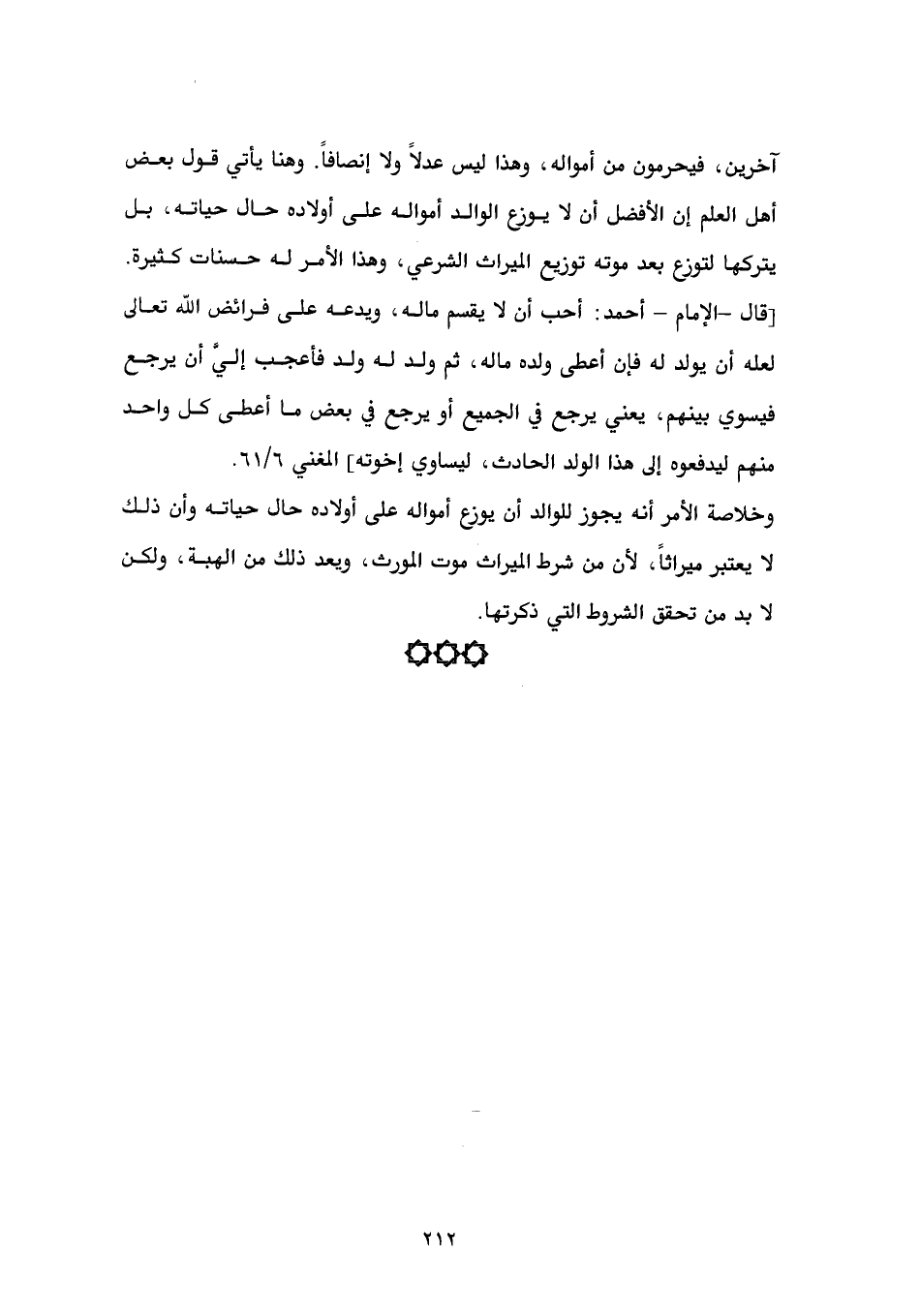 آخرين، فيحرمون من أمواله، وهذا ليس عدلاً ولا إنصافاً. وهنا يأتي قول بعض أهل العلم إن الأفضل أن لا يوزع الوالد أمواله على أولاده حال حياته، بل يتركها لتوزع بعد موته توزيع الميراث الشرعي، وهذا الأمر له حسنات كثيرة. [قال - الإمام - أحمد: أحب أن لا يقسم ماله، ويدعه على فرائض الله تعالى لعله أن يولد له فإن أعطى ولده ماله، ثم ولد له ولد فأعجب إليَّ أن يرجع فيسوي بينهم، يعني يرجع في الجميع أو يرجع في بعض