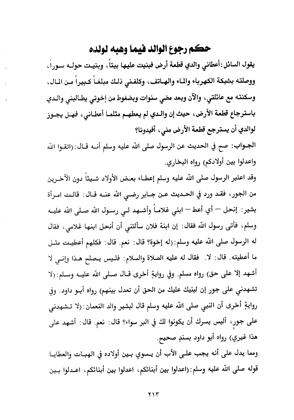 داود. وفي روايةٍ أخرى أن النبي صلى الله عليه وسلم قال لبشير والد النعمان: (لا تشهدني على جورٍ، أليس يسرك أن يكونوا لك في البر سواء؟ قال: نعم. قال: أشهد على هذا غيري) رواه أبو داود بسندٍ صحيح. ومما يدل على أنه يجب على الأب أن يسوي بين أولاده في الهبات والعطايا قوله صلى الله عليه وسلم: (اعدلوا بين أبنائكم، اعدلوا بين أبنائكم، اعدلوا بين