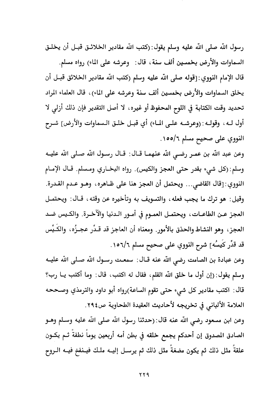 القلم، فقال له اكتب، قال: وما أكتب يا رب؟ قال: اكتب مقادير كل شيء حتى تقوم الساعة) رواه أبو داود والترمذي وصححه العلامة الألباني في تخريجه لأحاديث العقيدة الطحاوية ص294. وعن ابن مسعود رضي الله عنه قال: (حدثنا رسول الله صلى الله عليه وسلم وهو الصادق المصدوق إن أحدكم يجمع خلقه في بطن أمه أربعين يوماً نطفةً ثم يكون علقةً مثل ذلك ثم يكون مضغةً مثل ذلك ثم يرسل إليه ملك فينفخ فيه الروح