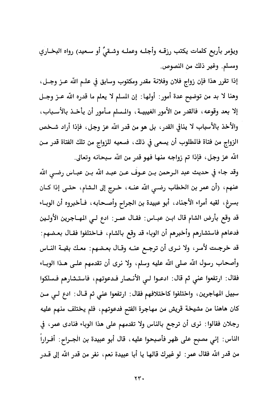 إذا تقرر هذا فإن زواج فلان وفلانة مقدر ومكتوب وسابق في علم الله عز وجل، وهنا لا بد من توضيح عدة أمور: أولها: إن المسلم لا يعلم ما قدره الله عز وجل إلا بعد وقوعه، فالقدر من الأمور الغيبية، والمسلم مأمور أن يأخذ بالأسباب، والأخذ بالأسباب لا ينافي القدر، بل هو من قدر الله عز وجل، فإذا أراد شخص الزواج من فتاة فالمطلوب أن يسعى في ذلك، فسعيه للزواج من تلك الفتاة قدر من الله عز وجل، فإذا تم زواجه منها فهو قدر من الله سبحانه وتعالى. وقد جاء في حديث عبد الرحمن بن عوف عن عبد الله بن عباس رضي الله عنهم، أن عمر بن الخطاب رضي الله عنه، خرج إلى الشام، حتى إذا كان بسرغ، لقيه أمراء الأجناد، أبو عبيدة بن الجراح وأصحابه، فأخبروه أن الوباء قد وقع بأرض الشام قال ابن عباس: فقال عمر: ادع لي المهاجرين الأولين فدعاهم فاستشارهم وأخبرهم أن الوباء قد وقع بالشام، فاختلفوا فقال بعضهم: قد خرجت لأمر، ولا نرى أن ترجع عنه وقال بعضهم: معك بقية الناس وأصحاب رسول الله صلى الله عليه وسلم، ولا نرى أن تقدمهم على هذا الوباء فقال: ارتفعوا عني ثم قال: ادعوا لي الأنصار فدعوتهم، فاستشارهم فسلكوا سبيل المهاجرين، واختلفوا كاختلافهم فقال: ارتفعوا عني ثم قال: ادع لي من كان ههنا من مشيخة قريش من مهاجرة الفتح فدعوتهم، فلم يختلف منهم عليه رجلان فقالوا: نرى أن ترجع بالناس ولا تقدمهم على هذا الوباء فنادى عمر، في الناس: إني مصبح على ظهر فأصبحوا عليه، قال أبو عبيدة بن الجراح: أفراراً من قدر الله فقال عمر: لو غيرك قالها يا أبا عبيدة نعم، نفر من قدر