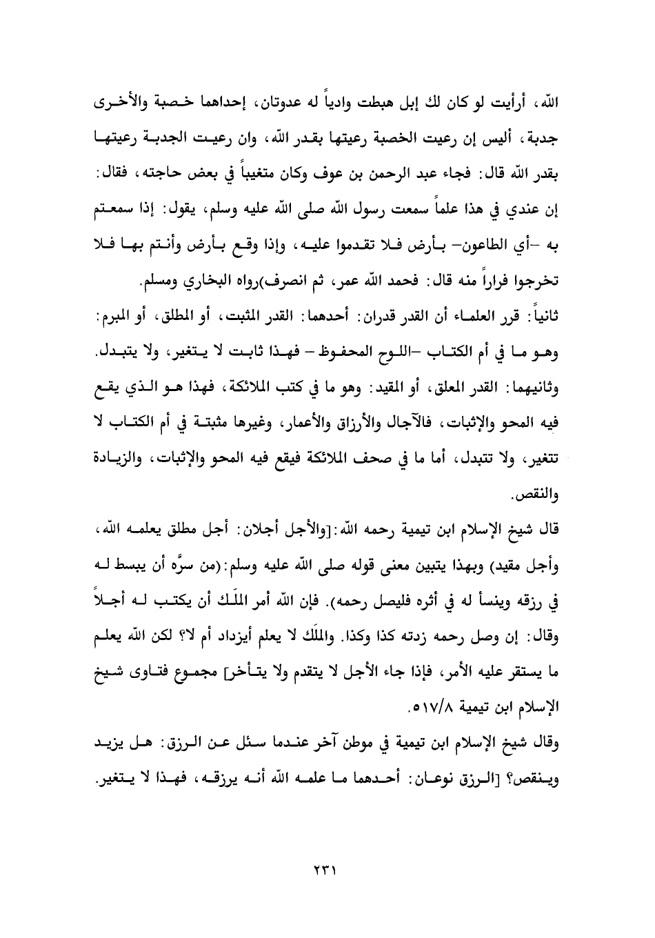 ثانياً: قرر العلماء أن القدر قدران: أحدهما: القدر المثبت، أو المطلق، أو المبرم: وهو ما في أم الكتاب - اللوح المحفوظ - فهذا ثابت لا يتغير، ولا يتبدل. وثانيهما: القدر المعلق، أو المقيد: وهو ما في كتب الملائكة، فهذا هو الذي يقع فيه المحو والإثبات، فالآجال والأرزاق والأعمار، وغيرها مثبتة في أم الكتاب لا تتغير، ولا تتبدل، أما ما في صحف الملائكة فيقع فيه المحو والإثبات، والزيادة والنقص. قال شيخ الإسلام ابن تيمية رحمه الله: [والأجل أجلان: أجل مطلق يعلمه الله، وأجل مقيد) وبهذا يتبين معنى قوله صلى الله عليه وسلم: (من سرَّه أن يبسط له في رزقه وينسأ له في أثره فليصل رحمه). فإن الله أمر الملَك أن يكتب له أجلاً وقال: إن وصل رحمه زدته كذا وكذا. والملَك لا يعلم أيزداد أم لا؟ لكن الله يعلم ما يستقر عليه الأمر، فإذا جاء الأجل لا يتقدم ولا يتأخر] مجموع فتاوى شيخ الإسلام ابن تيمية 8/ 517. وقال شيخ الإسلام ابن تيمية في موطن آخر عندما سئل عن الرزق: هل يزيد وينقص؟ [الرزق نوعان: أحدهما ما علمه الله أنه يرزقه، فهذا لا يتغير.