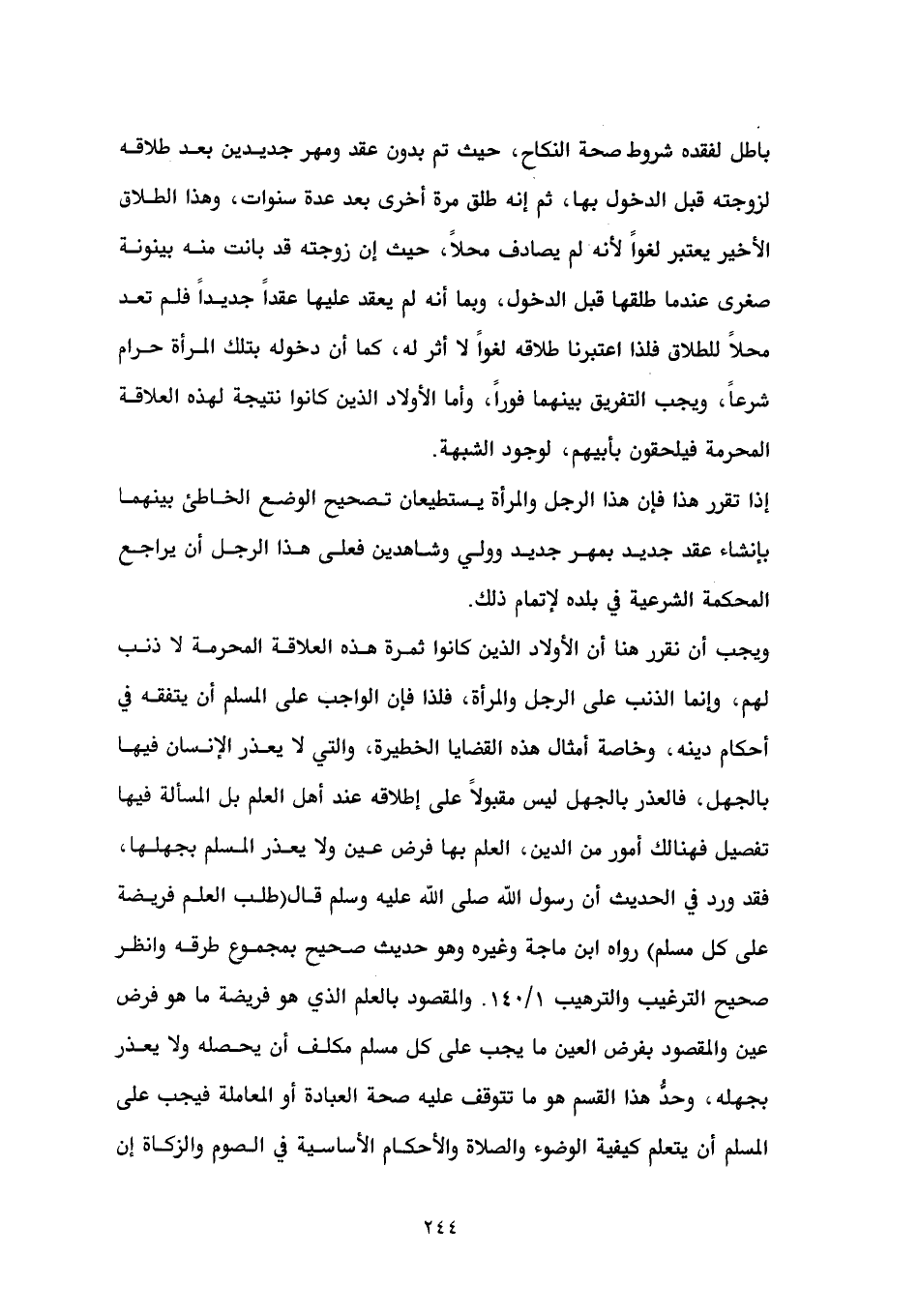 ويجب أن نقرر هنا أن الأولاد الذين كانوا ثمرة هذه العلاقة المحرمة لا ذنب لهم، وإنما الذنب على الرجل والمرأة، فلذا فإن الواجب على المسلم أن يتفقه في أحكام دينه، وخاصة أمثال هذه القضايا الخطيرة، والتي لا يعذر الإنسان فيها بالجهل، فالعذر بالجهل ليس مقبولاً على إطلاقه عند أهل العلم بل المسألة فيها تفصيل فهنالك أمور من الدين، العلم بها فرض عين ولا يعذر المسلم بجهلها، فقد ورد في الحديث أن رسول الله صلى الله عليه وسلم قال (طلب العلم فريضة على كل مسلم) رواه ابن ماجة وغيره وهو حديث صحيح بمجموع طرقه وانظر صحيح الترغيب والترهيب 1/ 140. والمقصود بالعلم الذي هو فريضة ما هو فرض عين والمقصود بفرض العين ما يجب على كل مسلم مكلف أن يحصله ولا يعذر بجهله، وحدُّ هذا القسم هو ما تتوقف عليه صحة العبادة أو المعاملة فيجب على المسلم أن يتعلم كيفية الوضوء والصلاة والأحكام الأساسية في الصوم والزكاة إن