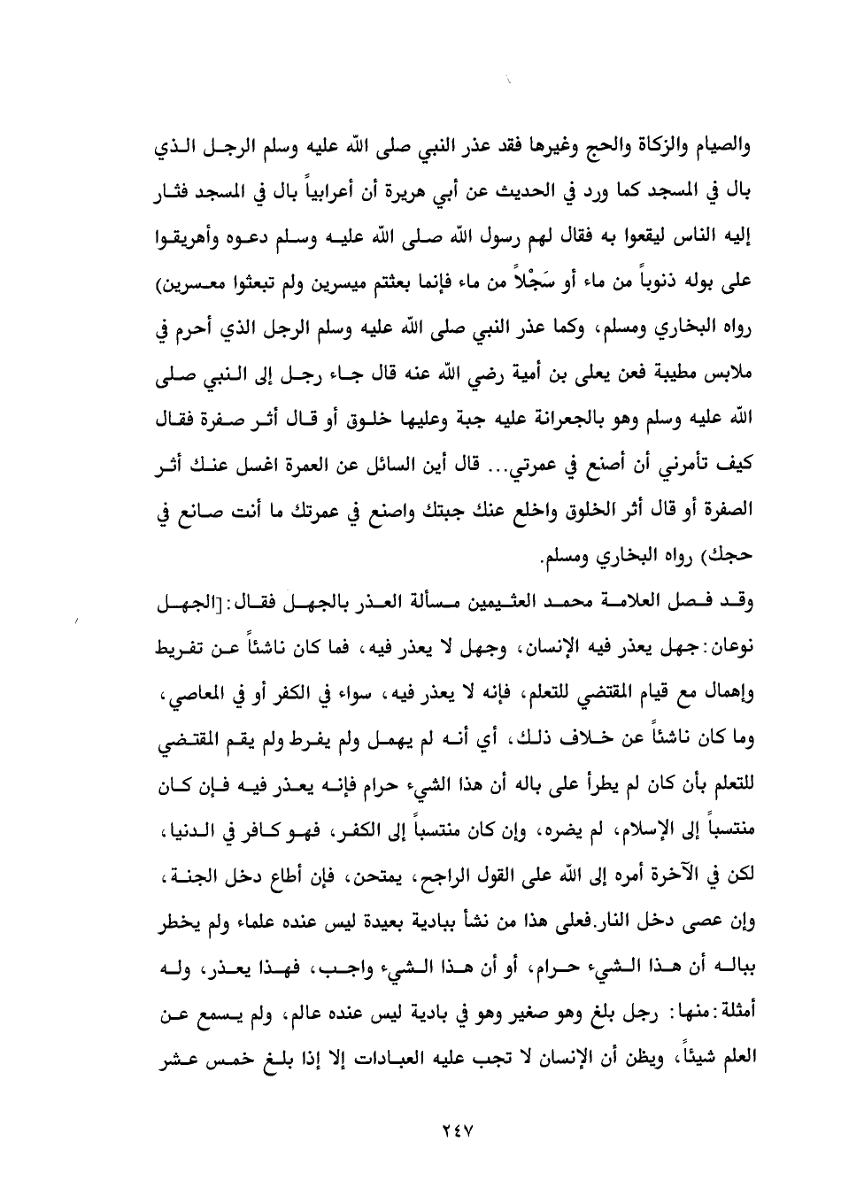 والصيام والزكاة والحج وغيرها فقد عذر النبي صلى الله عليه وسلم الرجل الذي بال في المسجد كما ورد في الحديث عن أبي هريرة أن أعرابياً بال في المسجد فثار إليه الناس ليقعوا به فقال لهم رسول الله صلى الله عليه وسلم دعوه وأهريقوا على بوله ذنوباً من ماء أو سجلاً من ماء فإنما بعثتم ميسرين ولم تبعثوا معسرين) رواه البخاري ومسلم، وكما عذر النبي صلى الله عليه وسلم الرجل الذي أحرم في ملابس مطيبة فعن يعلى بن أمية رضي الله عنه قال جاء رجل إلى النبي صلى الله عليه وسلم وهو بالجعرانة عليه جبة وعليها خلوق أو قال أثر صفرة فقال كيف تأمرني أن أصنع في عمرتي ... قال أين السائل عن العمرة اغسل عنك أثر الصفرة أو قال أثر الخلوق واخلع عنك جبتك واصنع في عمرتك ما أنت صانع في حجك) رواه البخاري ومسلم.