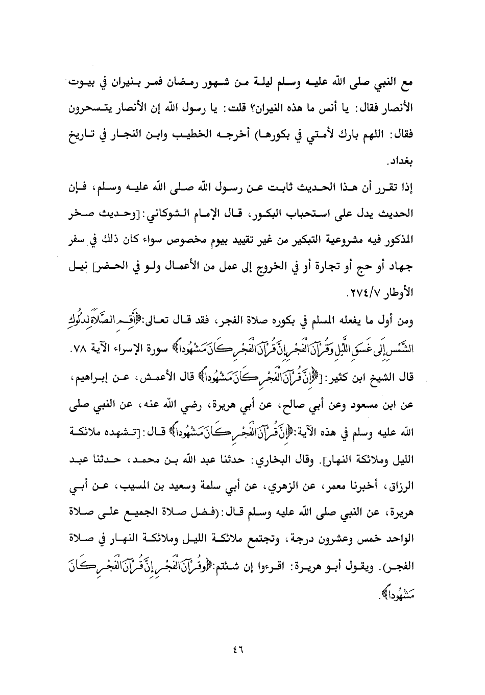 ومن أول ما يفعله المسلم في بكوره صلاة الفجر، فقد قال تعالى: {أَقِمِ الصَّلاَةَ لِدُلُوكِ الشَّمْسِ إِلَى غَسَقِ اللَّيْلِ وَقُرْآنَ الْفَجْرِ إِنَّ قُرْآنَ الْفَجْرِ كَانَ مَشْهُوداً} سورة الإسراء الآية 78. قال الشيخ ابن كثير: [{إِنَّ قُرْآنَ الْفَجْرِ كَانَ مَشْهُوداً} قال الأعمش، عن إبراهيم، عن ابن مسعود وعن أبي صالح، عن أبي هريرة، رضي الله عنه، عن النبي صلى الله عليه وسلم في هذه الآية: {إِنَّ قُرْآنَ الْفَجْرِ كَانَ مَشْهُوداً} قال: [تشهده ملائكة الليل وملائكة النهار]. وقال البخاري: حدثنا عبد الله بن محمد، حدثنا عبد الرزاق، أخبرنا معمر، عن الزهري، عن أبي سلمة وسعيد بن المسيب، عن أبي هريرة، عن النبي صلى الله عليه وسلم قال: (فضل صلاة الجميع على صلاة الواحد خمس وعشرون درجة، وتجتمع ملائكة الليل وملائكة النهار في صلاة الفجر). ويقول أبو هريرة: اقرءوا إن شئتم: {وقُرْآنَ الْفَجْرِ إِنَّ قُرْآنَ الْفَجْرِ كَانَ مَشْهُوداً}.