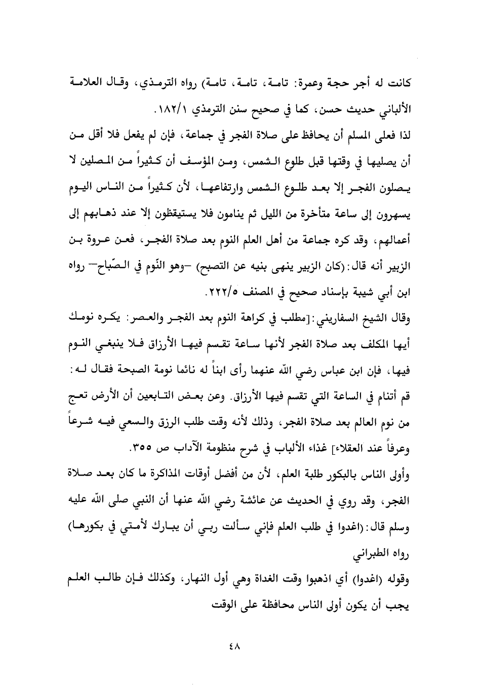 لذا فعلى المسلم أن يحافظ على صلاة الفجر في جماعة، فإن لم يفعل فلا أقل من أن يصليها في وقتها قبل طلوع الشمس، ومن المؤسف أن كثيراً من المصلين لا يصلون الفجر إلا بعد طلوع الشمس وارتفاعها، لأن كثيراً من الناس اليوم يسهرون إلى ساعة متأخرة من الليل ثم ينامون فلا يستيقظون إلا عند ذهابهم إلى أعمالهم، وقد كره جماعة من أهل العلم النوم بعد صلاة الفجر، فعن عروة بن الزبير أنه قال: (كان الزبير ينهى بنيه عن التصبح) - وهو النّوم في الصّباح - رواه ابن أبي شيبة بإسناد صحيح في المصنف 5/ 222.