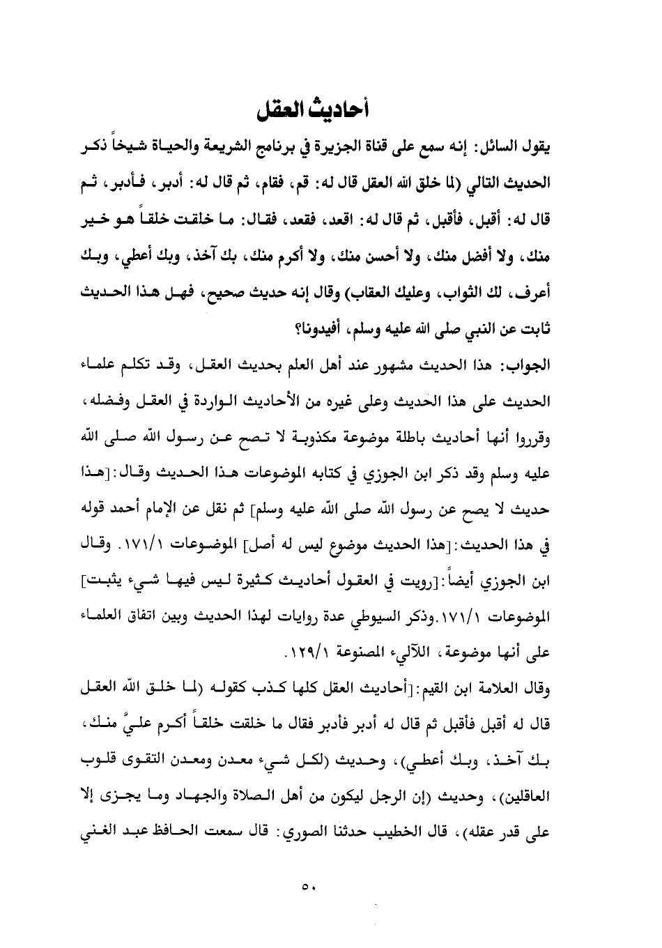 وقال العلامة ابن القيم: [أحاديث العقل كلها كذب كقوله (لما خلق الله العقل قال له أقبل فأقبل ثم قال له أدبر فأدبر فقال ما خلقت خلقاً أكرم عليَّ منك، بك آخذ، وبك أعطي)، وحديث (لكل شيء معدن ومعدن التقوى قلوب العاقلين)، وحديث (إن الرجل ليكون من أهل الصلاة والجهاد وما يجزى إلا على قدر عقله)، قال الخطيب حدثنا الصوري: قال سمعت الحافظ عبد الغني