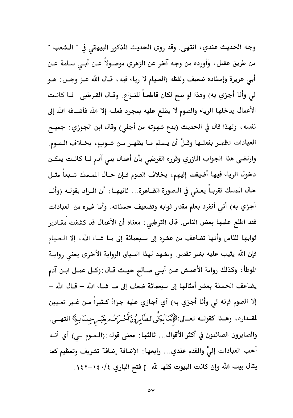 وجه الحديث عندي، انتهى. وقد روى الحديث المذكور البيهقي في " الشعب " من طريق عقيل، وأورده من وجه آخر عن الزهري موصولاً عن أبي سلمة عن أبي هريرة وإسناده ضعيف ولفظه (الصيام لا رياء فيه، قال الله عز وجل: هو لي وأنا أجزي به) وهذا لو صح لكان قاطعاً للنزاع. وقال القرطبي: لما كانت الأعمال يدخلها الرياء والصوم لا يطلع عليه بمجرد فعله إلا الله فأضافه الله إلى نفسه، ولهذا قال في الحديث (يدع شهوته من أجلي) وقال ابن الجوزي: جميع العبادات تظهر بفعلها وقلَّ أن يسلم ما يظهر من شوبٍ، بخلاف الصوم. وارتضى هذا الجواب المازري وقرره القرطبي بأن أعمال بني آدم لما كانت يمكن دخول الرياء فيها أضيفت إليهم، بخلاف الصوم فإن حال الممسك شبعاً مثل حال الممسك تقرباً يعني في الصورة الظاهرة ... ثانيها: أن المراد بقوله (وأنا أجزي
