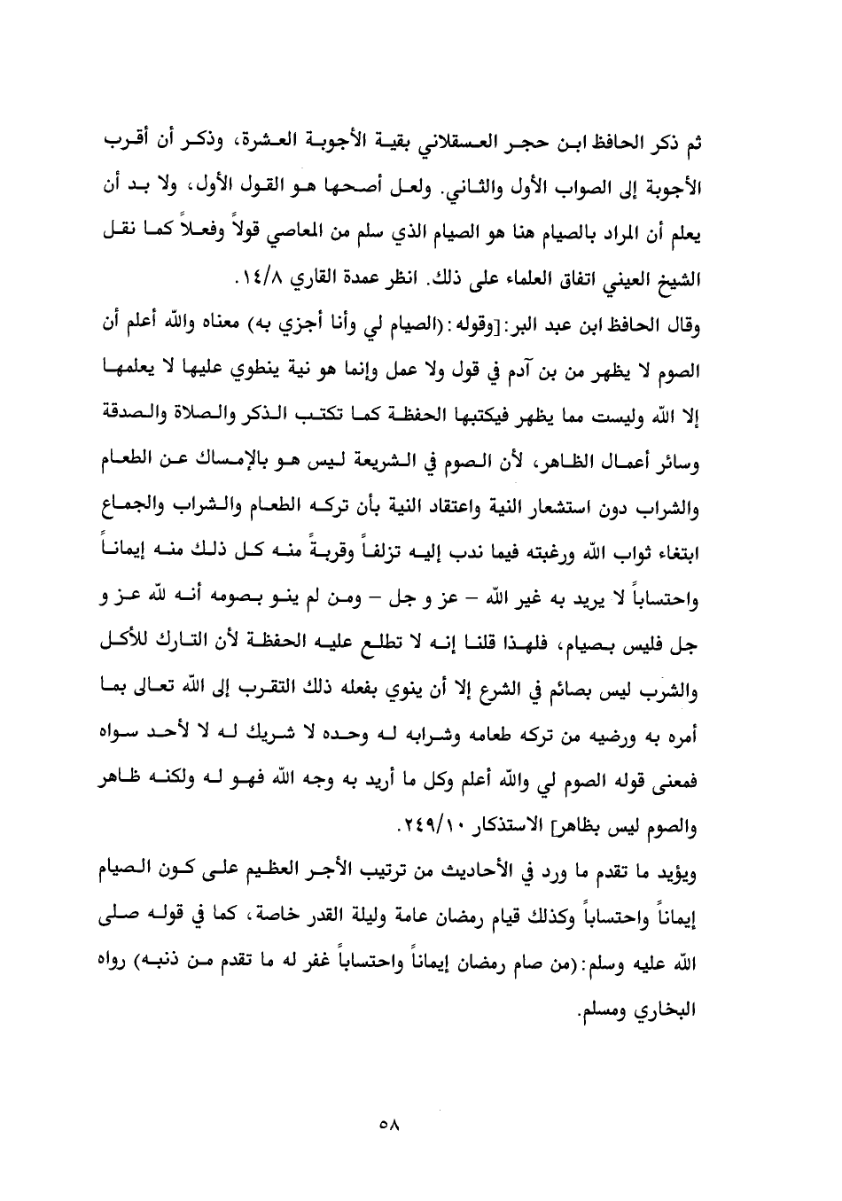 ويؤيد ما تقدم ما ورد في الأحاديث من ترتيب الأجر العظيم على كون الصيام إيماناً واحتساباً وكذلك قيام رمضان عامة وليلة القدر خاصة، كما في قوله صلى الله عليه وسلم: (من صام رمضان إيماناً واحتساباً غفر له ما تقدم من ذنبه) رواه البخاري ومسلم.