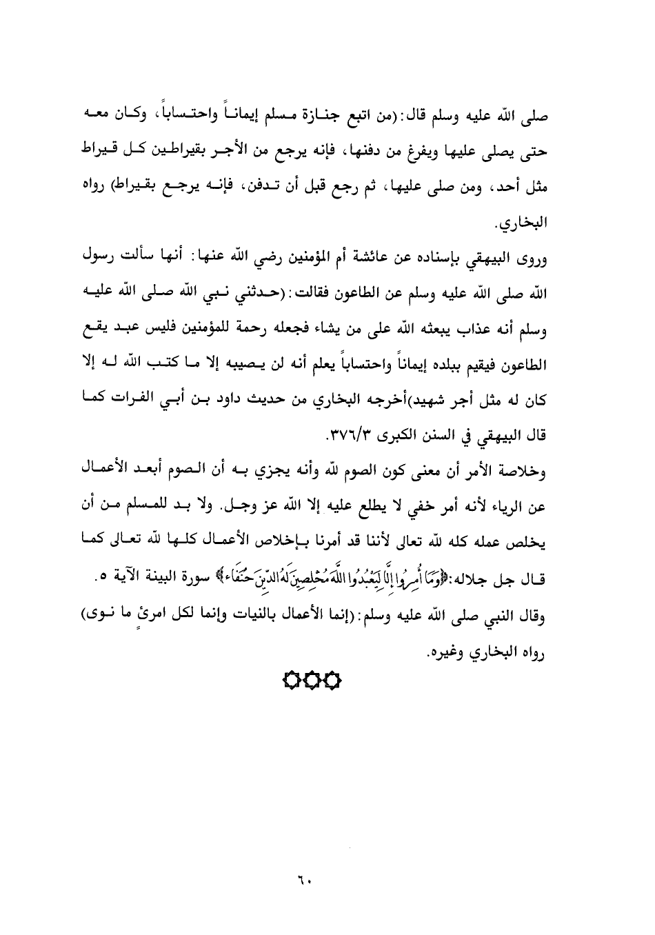 وروى البيهقي بإسناده عن عائشة أم المؤمنين رضي الله عنها: أنها سألت رسول الله صلى الله عليه وسلم عن الطاعون فقالت: (حدثني نبي الله صلى الله عليه وسلم أنه عذاب يبعثه الله على من يشاء فجعله رحمة للمؤمنين فليس عبد يقع الطاعون فيقيم ببلده إيماناً واحتساباً يعلم أنه لن يصيبه إلا ما كتب الله له إلا كان له مثل أجر شهيد) أخرجه البخاري من حديث داود بن أبي الفرات كما قال البيهقي في السنن الكبرى 3/ 376.