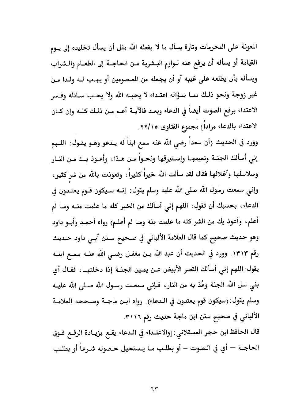 تخليده إلى يوم القيامة أو يسأله أن يرفع عنه لوازم البشرية من الحاجة إلى الطعام والشراب ويسأله بأن يطلعه على غيبه أو أن يجعله من المعصومين أو يهب له ولدا من غير زوجة ونحو ذلك مما سؤاله اعتداء لا يحبه الله ولا يحب سائله وفسر الاعتداء برفع الصوت أيضاً في الدعاء وبعد فالآية أعم من ذلك كله وإن كان الاعتداء بالدعاء مراداً] مجموع الفتاوى 15/ 22. وورد في الحديث (أن سعداً رضي الله عنه سمع ابناً له يدعو وهو يقول: اللهم إني أسألك الجنة ونعيمها وإستبرقها ونحواً من هذا، وأعوذ بك من النار وسلاسلها وأغلالها فقال لقد سألت الله خيراً كثيراً، وتعوذت بالله من شرٍ كثير، وإني سمعت رسول الله صلى الله عليه وسلم يقول: إنه سيكون قوم يعتدون في الدعاء، بحسبك أن تقول: اللهم إني أسألك من الخير كله ما علمت منه وما لم أعلم، وأعوذ بك من الشر كله ما علمت منه وما لم أعلم) رواه أحمد وأبو داود وهو حديث صحيح كما قال العلامة الألباني في صحيح سنن أبي داود حديث رقم 1313. وورد في الحديث أن عبد الله بن مغفل رضي الله عنه سمع ابنه يقول: اللهم إني أسألك القصر الأبيض عن يمين الجنة إذا دخلتها، فقال أي بني سل الله الجنة وعُذ به من النار، فإني سمعت رسول الله صلى الله عليه وسلم يقول: (سيكون قوم يعتدون في الدعاء). رواه ابن ماجة وصححه العلامة الألباني في صحيح سنن ابن ماجة حديث رقم 3116. قال الحافظ ابن حجر العسقلاني: [والاعتداء في الدعاء يقع بزيادة الرفع فوق الحاجة - أي في الصوت - أو بطلب ما يستحيل حصوله شرعاً أو بطلب