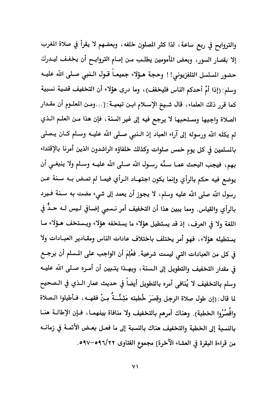 والتروايح في ربع ساعة، لذا كثر المصلون خلفه، وبعضهم لا يقرأ في صلاة المغرب إلا بقصار السور، وبعض المأمومين يطلب من إمام التروايح أن يخفف ليدرك حضور المسلسل التلفزيوني!! وحجة هؤلاء جميعاً قول النبي صلى الله عليه وسلم: (إذا أمَّ أحدكم الناس فليخفف)، وما درى هؤلاء أن