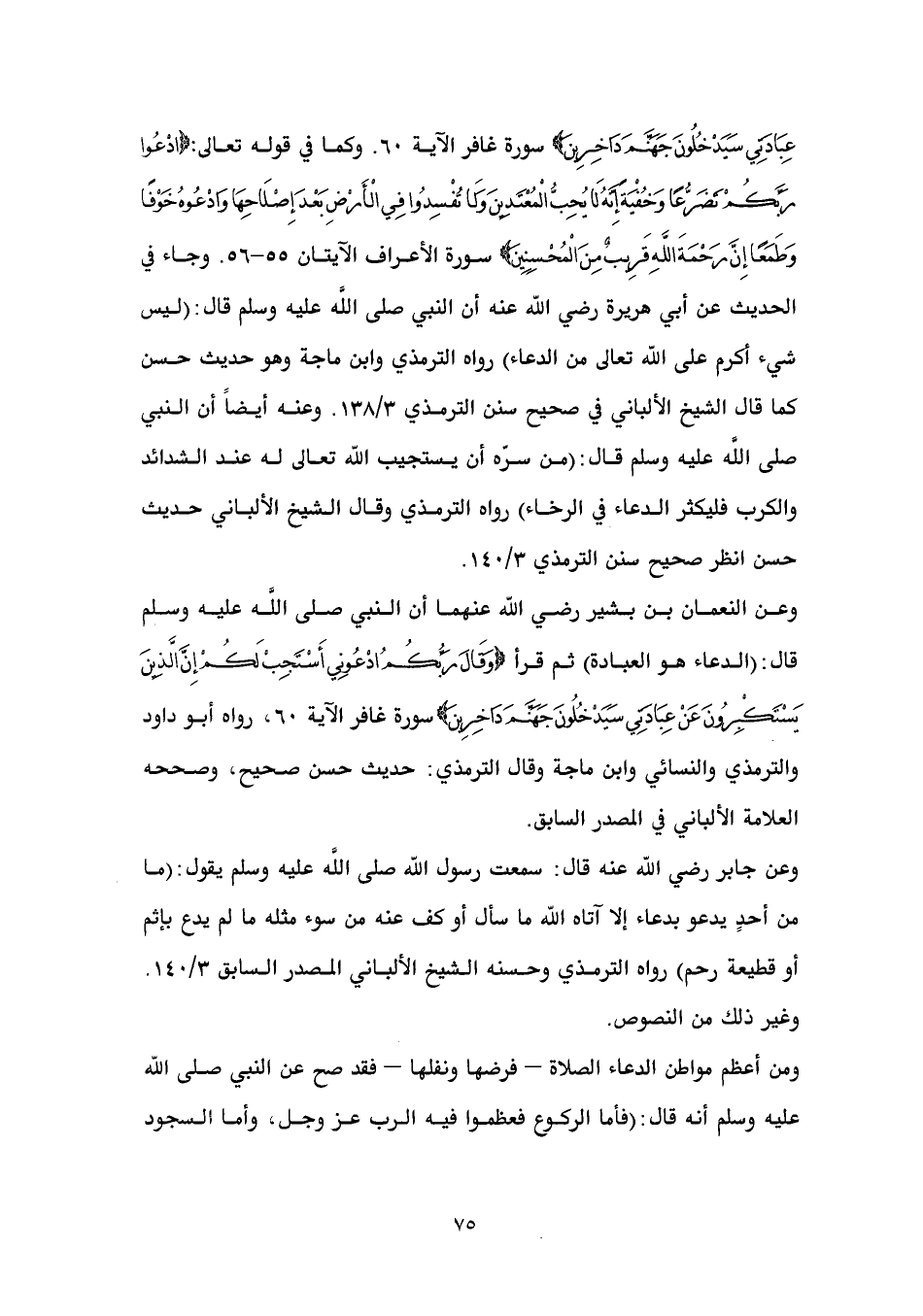 عِبَادَتِي سَيَدْخُلُونَ جَهَنَّمَ دَاخِرِينَ} سورة غافر الآية 60، رواه أبو داود والترمذي والنسائي وابن ماجة وقال الترمذي: حديث حسن صحيح، وصححه العلامة الألباني في المصدر السابق.