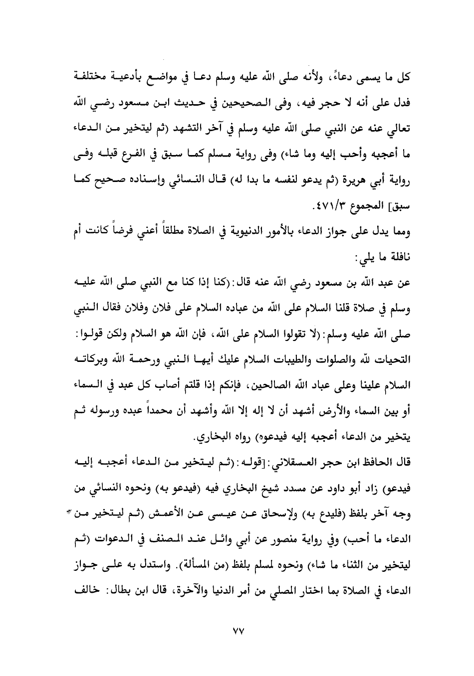 النسائي من وجه آخر بلفظ (فليدع به) ولإسحاق عن عيسى عن الأعمش (ثم ليتخير من الدعاء ما أحب) وفي رواية منصور عن أبي وائل عند المصنف في الدعوات (ثم ليتخير من الثناء ما شاء) ونحوه لمسلم بلفظ (من المسألة). واستدل به على جواز الدعاء في الصلاة بما اختار المصلي من أمر الدنيا والآخرة، قال ابن بطال: خالف