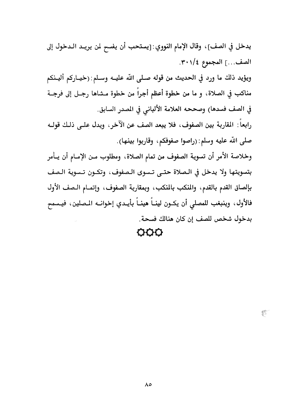 وخلاصة الأمر أن تسوية الصفوف من تمام الصلاة، ومطلوب من الإمام أن يأمر بتسويتها ولا يدخل في الصلاة حتى تسوى الصفوف، وتكون تسوية الصف بإلصاق القدم بالقدم، والمنكب بالمنكب، وبمقاربة الصفوف، وإتمام الصف الأول فالأول، وينبغب للمصلي أن يكون ليناً هيناً بأيدي إخوانه المصلين، فيسمح بدخول شخص للصف إن كان هنالك فسحة.