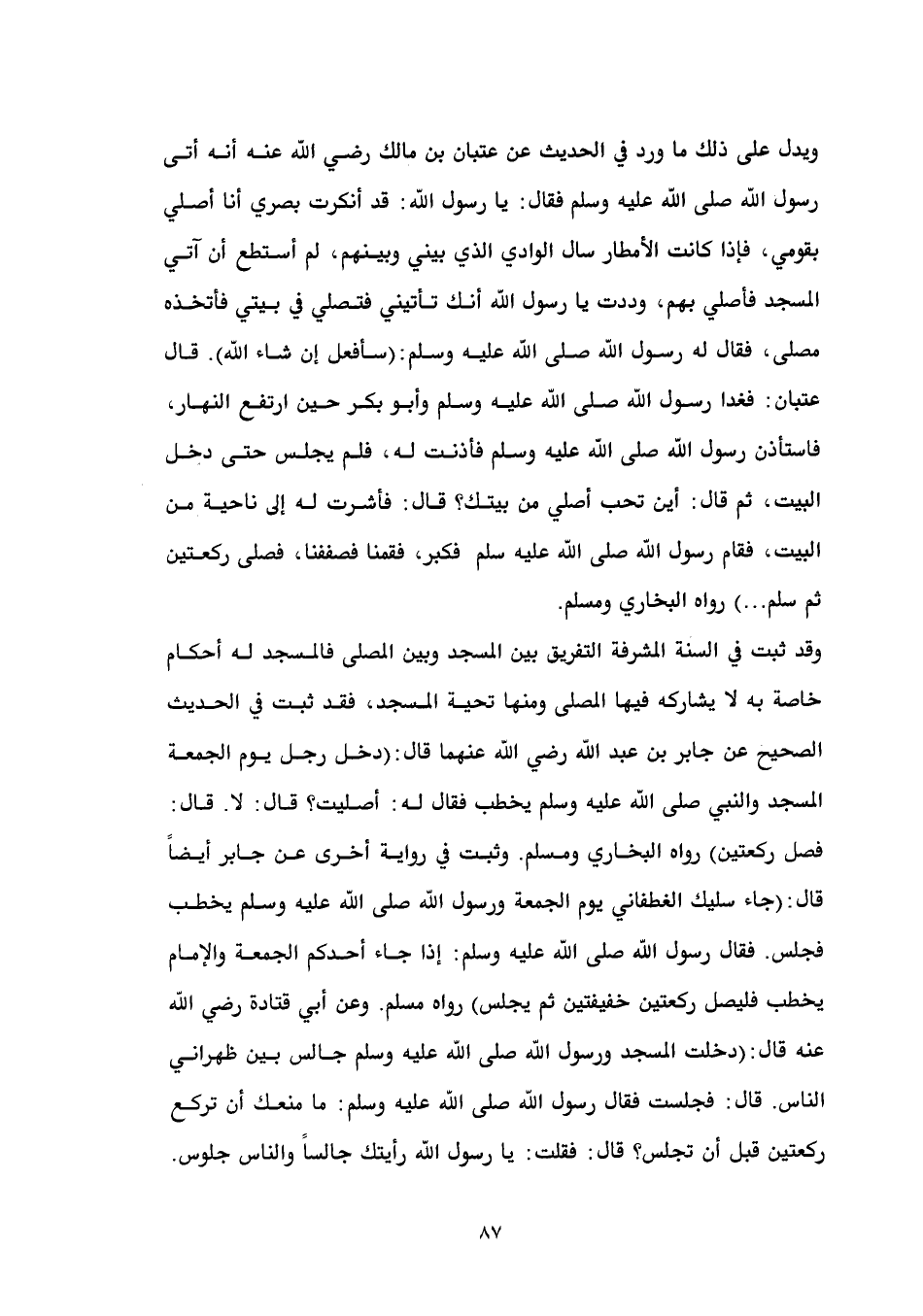 رسول الله أنك تأتيني فتصلي في بيتي فأتخذه مصلى، فقال له رسول الله صلى الله عليه وسلم: (سأفعل إن شاء الله). قال عتبان: فغدا رسول الله صلى الله عليه وسلم وأبو بكر حين ارتفع النهار، فاستأذن رسول الله صلى الله عليه وسلم فأذنت له، فلم يجلس حتى دخل البيت، ثم قال: أين تحب أصلي من بيتك؟ قال: فأشرت له إلى ناحية من البيت، فقام رسول الله صلى الله عليه سلم فكبر، فقمنا فصففنا، فصلى ركعتين ثم سلم ... ) رواه البخاري ومسلم.