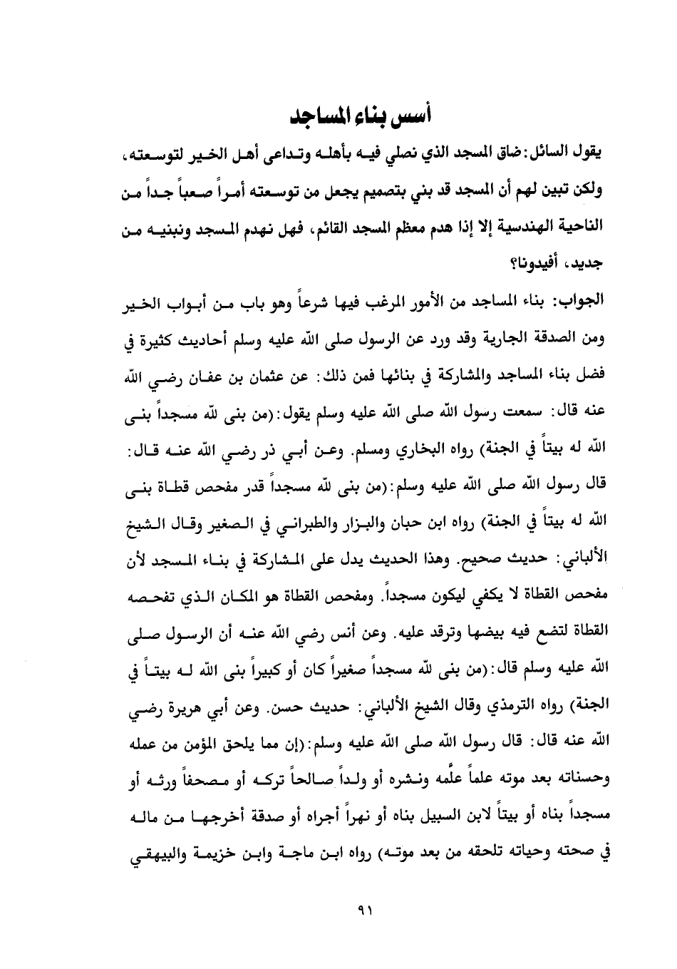مسجداً. ومفحص القطاة هو المكان الذي تفحصه القطاة لتضع فيه بيضها وترقد عليه. وعن أنس رضي الله عنه أن الرسول صلى الله عليه وسلم قال: (من بنى لله مسجداً صغيراً كان أو كبيراً بنى الله له بيتاً في الجنة) رواه الترمذي وقال الشيخ الألباني: حديث حسن. وعن أبي هريرة رضي الله عنه قال: قال رسول الله صلى الله عليه وسلم: (إن مما يلحق المؤمن من عمله وحسناته بعد موته علماً علَّمه ونشره أو ولداً صالحاً تركه أو مصحفاً ورثه أو مسجداً بناه أو بيتاً لابن السبيل بناه أو نهراً أجراه أو صدقة أخرجها من ماله في صحته وحياته تلحقه من بعد موته) رواه ابن ماجة وابن خزيمة والبيهقي