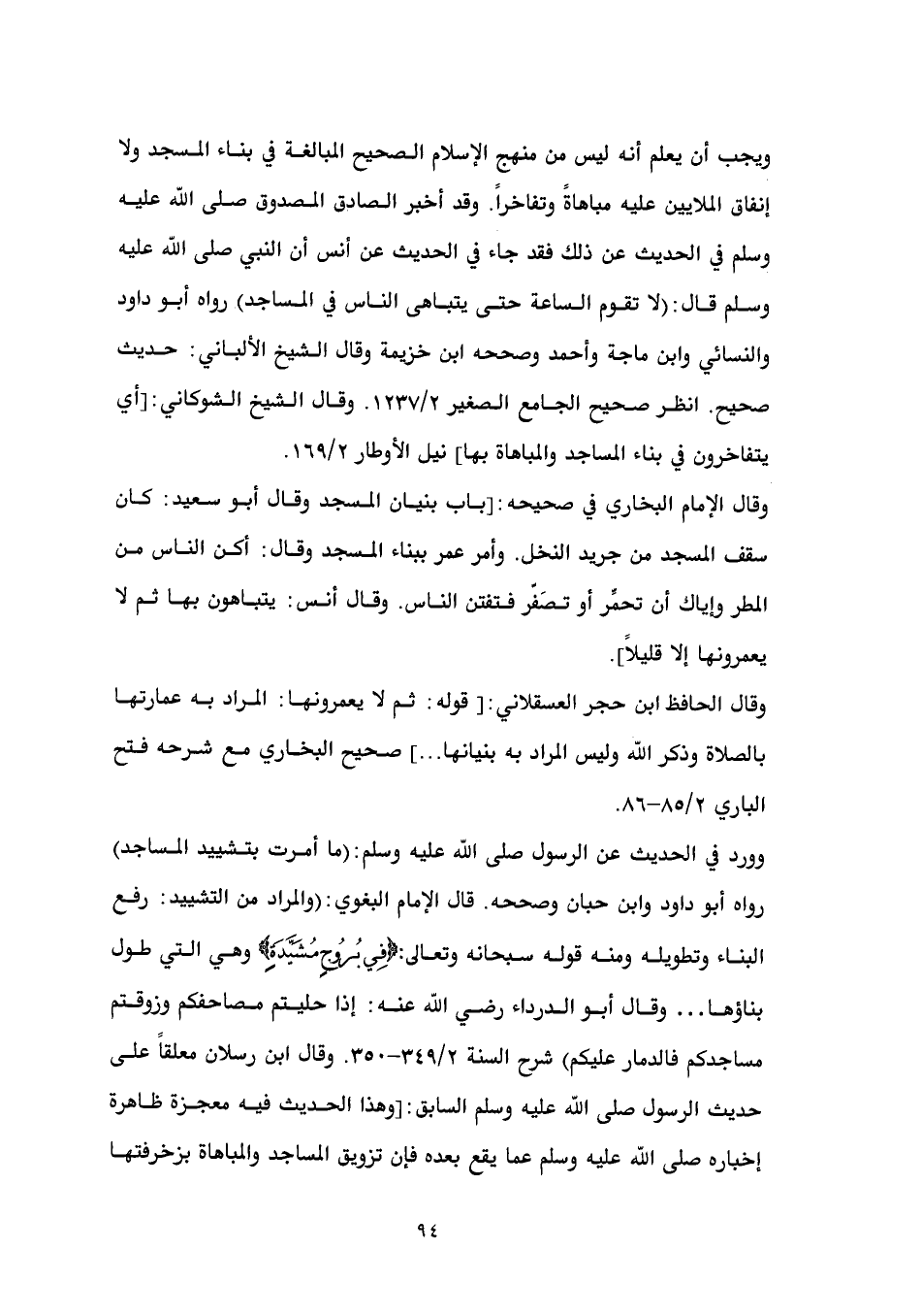 ويجب أن يعلم أنه ليس من منهج الإسلام الصحيح المبالغة في بناء المسجد ولا إنفاق الملايين عليه مباهاةً وتفاخراً. وقد أخبر الصادق المصدوق صلى الله عليه وسلم في الحديث عن ذلك فقد جاء في الحديث عن أنس أن النبي صلى الله عليه وسلم قال: (لا تقوم الساعة حتى يتباهى الناس في المساجد) رواه أبو داود والنسائي وابن ماجة وأحمد وصححه ابن خزيمة وقال الشيخ الألباني: حديث صحيح. انظر صحيح الجامع الصغير 2/ 1237. وقال الشيخ الشوكاني: [أي يتفاخرون في بناء المساجد والمباهاة بها] نيل الأوطار 2/ 169.وقال الإمام البخاري في صحيحه: [باب بنيان المسجد وقال أبو سعيد: كان سقف المسجد من جريد النخل. وأمر عمر ببناء المسجد وقال: أكن الناس من المطر وإياك أن تحمِّر أو تصَفّر فتفتن الناس. وقال أنس: يتباهون بها ثم لا يعمرونها إلا قليلاً]. وقال الحافظ ابن حجر قوله: [ثم لا يعمرونها: المراد به عمارتها بالصلاة وذكر الله وليس المراد به بنيانها ... ] صحيح البخاري مع شرحه فتح الباري 2/ 85 - 86.وورد في الحديث عن الرسول صلى الله عليه وسلم: (ما أمرت بتشييد المساجد) رواه أبو داود وابن حبان وصححه. قال الإمام البغوي: (والمراد من التشييد: رفع البناء وتطويله ومنه قوله سبحانه وتعالى: {فِي بُرُوجٍ مُشَيَّدَةٍ} وهي التي طول بناؤها ... وقال أبو الدرداء رضي الله عنه: إذا حليتم مصاحفكم وزوقتم مساجدكم فالدمار عليكم) شرح السنة 2/ 349 - 350. وقال ابن رسلان معلقاً على حديث الرسول صلى الله عليه وسلم السابق: [وهذا الحديث فيه معجزة ظاهرة إخباره صلى الله عليه وسلم عما يقع بعده فإن تزويق المساجد والمباهاة بزخرفتها