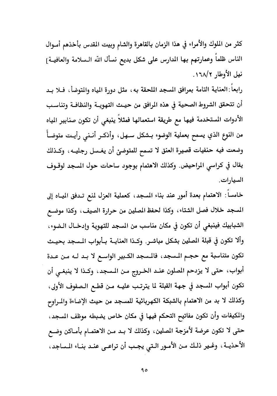 خامساً: الاهتمام بعدة أمور عند بناء المسجد، كعملية العزل لمنع تدفق المياه إلى المسجد خلال فصل الشتاء، وكذا لحفظ المصلين من حرارة الصيف، وكذا موضع الشبابيك فينبغي أن تكون في مكان مناسب من المسجد للتهوية وإدخال الضوء، وألا تكون في قبلة المصلين بشكل مباشر. وكذا العناية بأبواب المسجد بحيث تكون متناسبة مع حجم المسجد، فالمسجد الكبير الواسع لا بد له من عدة أبواب، حتى لا يزدحم المصلون عند الخروج من المسجد، وكذا لا ينبغي أن تكون أبواب المسجد في جهة القبلة لما يترتب عليه من قطع الصفوف الأولى، وكذلك لا بد من الاهتمام بالشبكة الكهربائية للمسجد من حيث الإضاءة والمراوح والمكيفات وأن تكون مفاتيح التحكم فيها في مكان خاص يضبطه موظف المسجد، حتى لا تكون عرضة لأمزجة المصلين، وكذلك لا بد من الاهتمام بأماكن وضع الأحذية، وغير ذلك من الأمور التي يجب أن تراعى عند بناء المساجد،