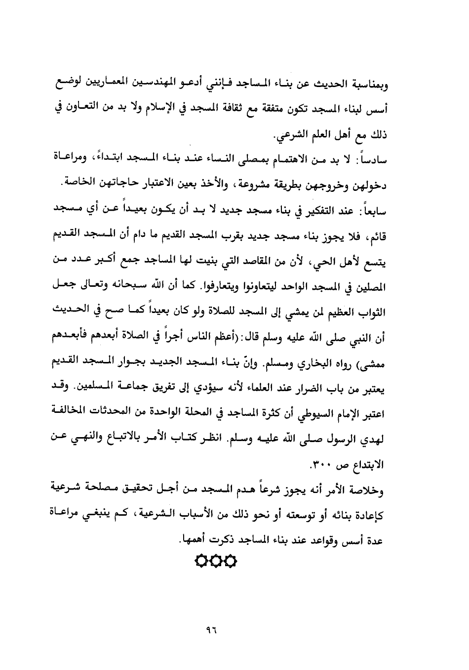 وبمناسبة الحديث عن بناء المساجد فإنني أدعو المهندسين المعماريين لوضع أسس لبناء المسجد تكون متفقة مع ثقافة المسجد في الإسلام ولا بد من التعاون في ذلك مع أهل العلم الشرعي.