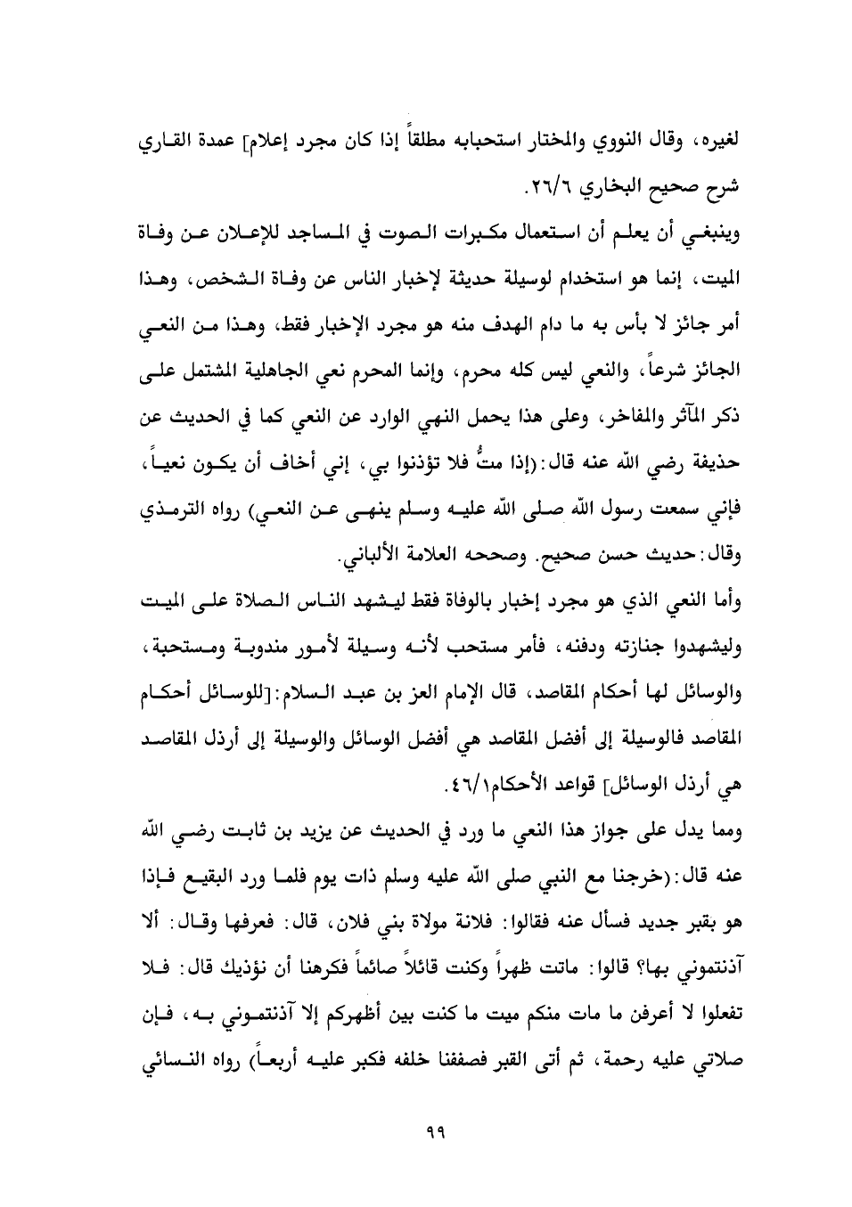 وأما النعي الذي هو مجرد إخبار بالوفاة فقط ليشهد الناس الصلاة على الميت وليشهدوا جنازته ودفنه، فأمر مستحب لأنه وسيلة لأمور مندوبة ومستحبة، والوسائل لها أحكام المقاصد، قال الإمام العز بن عبد السلام: [للوسائل أحكام المقاصد فالوسيلة إلى أفضل المقاصد هي أفضل الوسائل والوسيلة إلى أرذل المقاصد هي أرذل الوسائل] قواعد الأحكام1/ 46. ومما يدل على جواز هذا النعي ما ورد في الحديث عن يزيد بن ثابت رضي الله عنه قال: (خرجنا مع النبي صلى الله عليه وسلم ذات يوم فلما ورد البقيع فإذا هو بقبر جديد فسأل عنه فقالوا: فلانة مولاة بني فلان، قال: فعرفها وقال: ألا آذنتموني بها؟ قالوا: ماتت ظهراً وكنت قائلاً صائماً فكرهنا أن نؤذيك قال: فلا تفعلوا لا أعرفن ما مات منكم ميت ما كنت بين أظهركم إلا آذنتموني به، فإن صلاتي عليه رحمة، ثم أتى القبر فصففنا خلفه فكبر عليه أربعاً) رواه النسائي