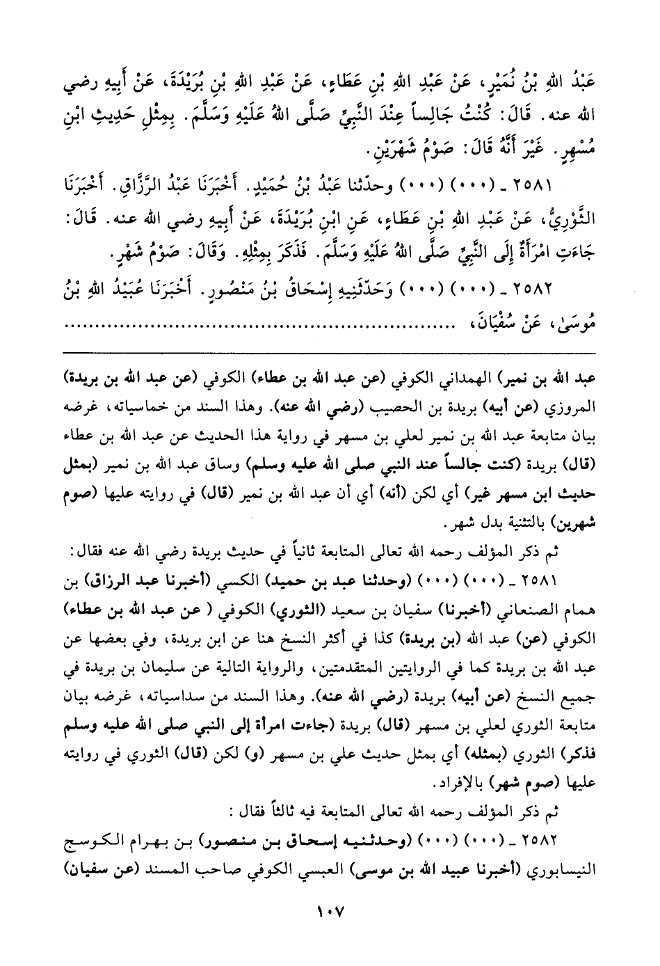 ٢٥٨١ - (٠٠) (٠٠) (وحدثنا عبد بن حميد) الكسي (أخبرنا عبد الرزاق) بن همام الصنعاني (أخبرنا) سفيان بن سعيد (الثوري) الكوفي (عن عبد الله بن عطاء) الكوفي (عن) عبد الله (بن بريدة) كذا في أكثر النسخ هنا عن ابن بريدة، وفي بعضها عن عبد الله بن بريدة كما في الروايتين المتقدمتين، والرواية التالية عن سليمان بن بريدة في جميع النسخ (عن أبيه) بريدة (رضي الله عنه). وهذا السند من سداسياته، غرضه بيان متابعة الثوري لعلي بن مسهر (قال) بريدة (جاءت امرأة إلى النبي صلى الله عليه وسلم فذكر) الثوري (بمثله) أي بمثل حديث علي بن مسهر (و) لكن (قال) الثوري في روايته عليها (صوم شهر) بالإفراد.