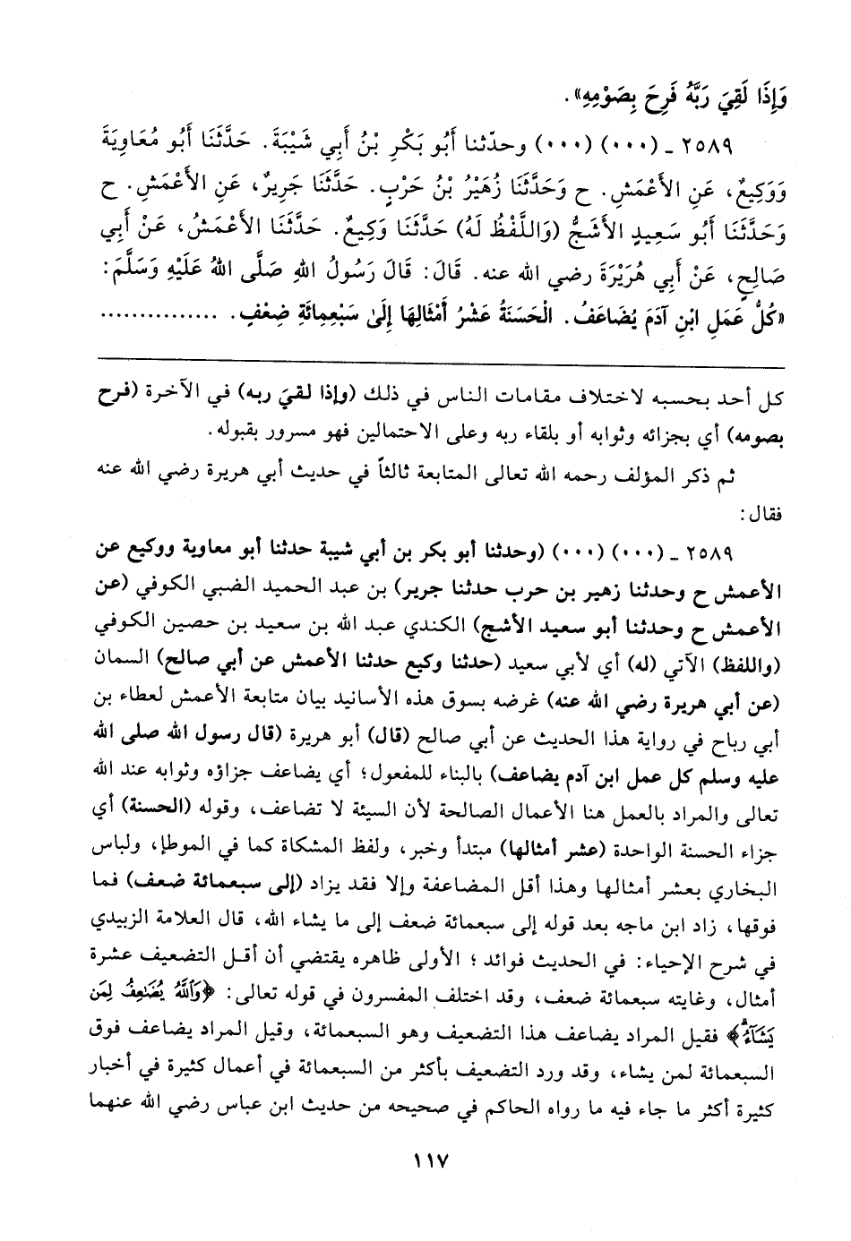 ٢٥٨٩ - (٠٠) (٠٠) وحدّثنا أَبُو بَكْرِ بْنُ أَبِي شَيبَةَ. حَدَّثَنَا أَبُو مُعَاويَةَ وَوَكِيعٌ، عَنِ الأَعْمَشِ. ح وَحَدَّثَنَا زُهَيرُ بْنُ حَرْبٍ. حَدَّثَنَا جَرِيرٌ، عَنِ الأَعْمَشِ. ح وَحَدَّثَنَا أبُو سَعِيدٍ الأَشَجُّ (وَاللَّفْظُ لَهُ) حَدَّثَنَا وَكِيعٌ. حَدَّثَنَا الأعْمَشُ، عَنْ أَبِي صَالِحٍ، عَنْ أَبِي هُرَيرَةَ رضي الله عنه. قَال: قَال رَسُولُ اللهِ صَلى اللهُ عَلَيهِ وَسَلمَ: "كُلُّ عَمَلِ ابْنِ آدَمَ يُضَاعَفُ. الْحَسَنَةُ عَشْرُ أَمْثَالِهَا إِلَى سَبْعِمِائَةِ ضِعْفٍ