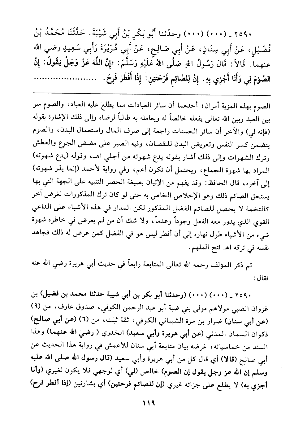 ٢٥٩٠ - (٠٠) (٠٠) (وحدثنا أبو بكر بن أبي شيبة حدثنا محمد بن فضيل) بن غزوان الضبي مولاهم مولى بني ضبة أبو عبد الرحمن الكوفي، صدوق عارف، من (٩) (عن أبي سنان) ضرار بن مرة الشيباني الكوفي، ثقة ثبت، من (٦) (عن أبي صالح) ذكوان السمان المدني (عن أبي هريرة وأبي سعيد) الخدري (رضي الله عنهما) وهذا السند من خماسياته، غرضه بيان متابعة أبي سنان للأعمش في رواية هذا الحديث عن أبي صالح (قالا) أي قال كل من أبي هريرة وأبي سعيد (قال رسول الله صلى الله عليه وسلم إن الله عزَّ وجلَّ يقول إن الصوم) خالص (لي) أي لوجهي فلا يكون لغيري (وأنا أجزي به) لا يطلع على جزائه غيري (أن للصائم فرحتين) أي بشارتين (إذا أفطر فرح)