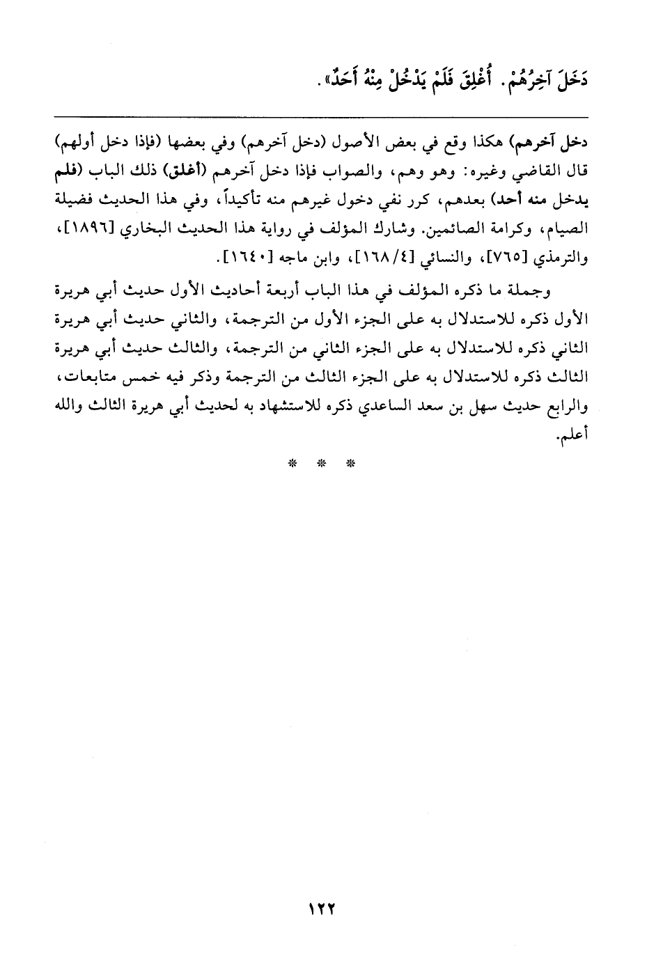 دخل آخرهم) هكذا وقع في بعض الأصول (دخل آخرهم) وفي بعضها (فإذا دخل أولهم) قال القاضي وغيره: وهو وهم، والصواب فإذا دخل اخرهم (أغلق) ذلك الباب (فلم يدخل منه أحد) بعدهم، كرر نفي دخول غيرهم منه تأكيدًا، وفي هذا الحديث فضيلة الصيام، وكرامة الصائمين. وشارك المؤلف في رواية هذا الحديث البخاري [١٨٩٦]، والترمذي [٧٦٥]، والنسائي [٤/ ١٦٨]، وابن ماجه [١٦٤٠].