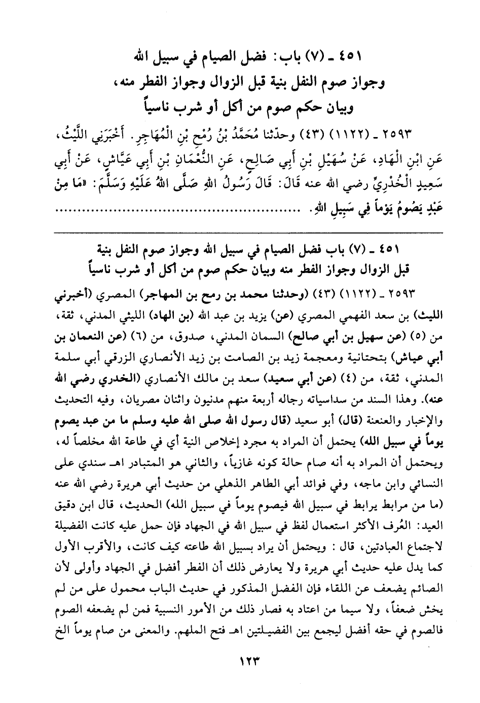 ٤٥١ - (٧) باب فضل الصيام في سبيل الله وجواز صوم النفل بنية قبل الزوال وجواز الفطر منه وبيان حكم صوم من أكل أو شرب ناسيًا