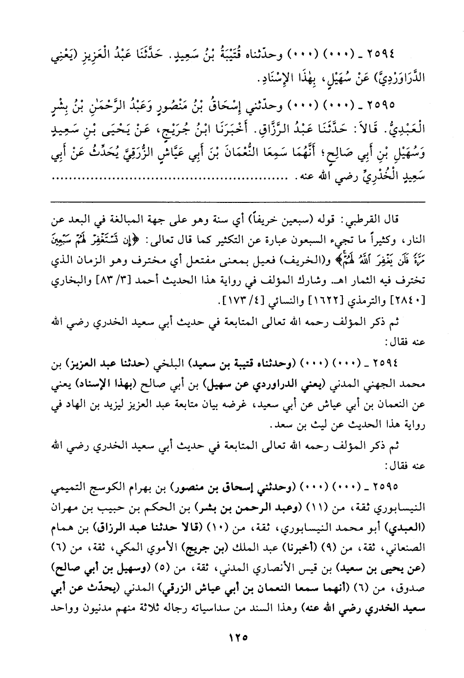 ٢٥٩٥ - (٠٠) (٠٠) (وحدثني إسحاق بن منصور) بن بهرام الكوسج التميمي النيسابوري ثقة، من (١١) (وعبد الرحمن بن بشر) بن الحكم بن حبيب بن مهران (العبدي) أبو محمد النيسابوري، ثقة، من (١٠) (قالا حدثنا عبد الرزاق) بن همام الصنعاني، ثقة، من (٩) (أخبرنا) عبد الملك (بن جريج) الأموي المكي، ثقة، من (٦) (عن يحيى بن سعيد) بن قيس الأنصاري المدني، ثقة، من (٥) (وسهيل بن أبي صالح) صدوق، من (٦) (أنهما سمعا النعمان بن أبي عياش الزرقي) المدني (يحدّث عن أبي سعيد الخدري رضي الله عنه) وهذا السند من سداسياته رجاله ثلاثة منهم مدنيون وواحد