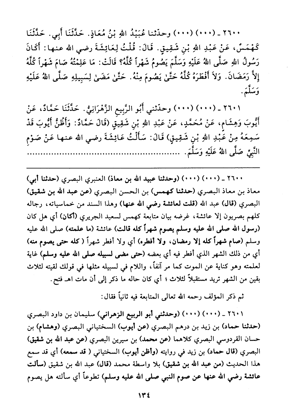 ٢٦٠١ - (٠٠) (٠٠) (وحدثني أبو الربيع الزهراني) سليمان بن داود البصري (حدثنا حماد) بن زيد بن درهم البصري (عن أيوب) السختياني البصري (وهشام) بن حسان القردوسي البصري كلاهما (عن محمد) بن سيرين البصري (عن عبد الله بن شقيق) البصري (قال حماد) بن زيد في روايته (وأظن أيوب) السختياني (قد سمعه) أي قد سمع هذا الحديث (من عبد الله بن شقيق) بلا واسطة محمد (قال) عبد الله بن شقيق (سألت عائشة رضي الله عنها عن صوم النبي صلى الله عليه وسلم) تطوعًا أي سألته هل يصوم