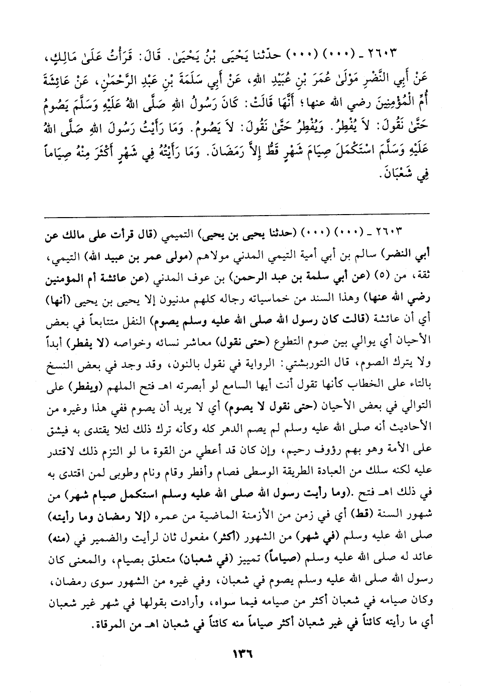 ٢٦٠٣ - (٠٠) (٠٠) حدَّثنا يَحْيَى بْنُ يَحْيَى. قَال: قَرَأتُ عَلَى مَالِكٍ، عَنْ أَبِي النَّضْرِ مَوْلَى عُمَرَ بْنِ عُبَيدِ اللهِ، عَنْ أَبِي سَلَمَةَ بْنِ عَبْدِ الرَّحْمَنِ، عَنْ عَائِشَةَ أُمِّ الْمُؤْمِنِينَ رضي الله عنها؛ أَنَّهَا قَالتْ: كَانَ رَسُولُ اللهِ صَلَّى اللهُ عَلَيهِ وَسَلَّمَ يَصُومُ حَتَّى نَقُولَ: لَا يُفْطِرُ. وَيُفْطِرُ حَتَّى نَقُولَ: لَا يَصُومُ. وَمَا رَأَيتُ رَسُولَ اللهِ صَلَّى اللهُ عَلَيهِ وَسَلَّمَ اسْتَكْمَلَ صِيَامَ شَهْرٍ قَطُّ إلا رَمَضَانَ. وَمَا رَأَيتُهُ فِي شَهْرٍ أَكْثَرَ مِنْهُ صِيَامًا فِي شَعْبَانَ