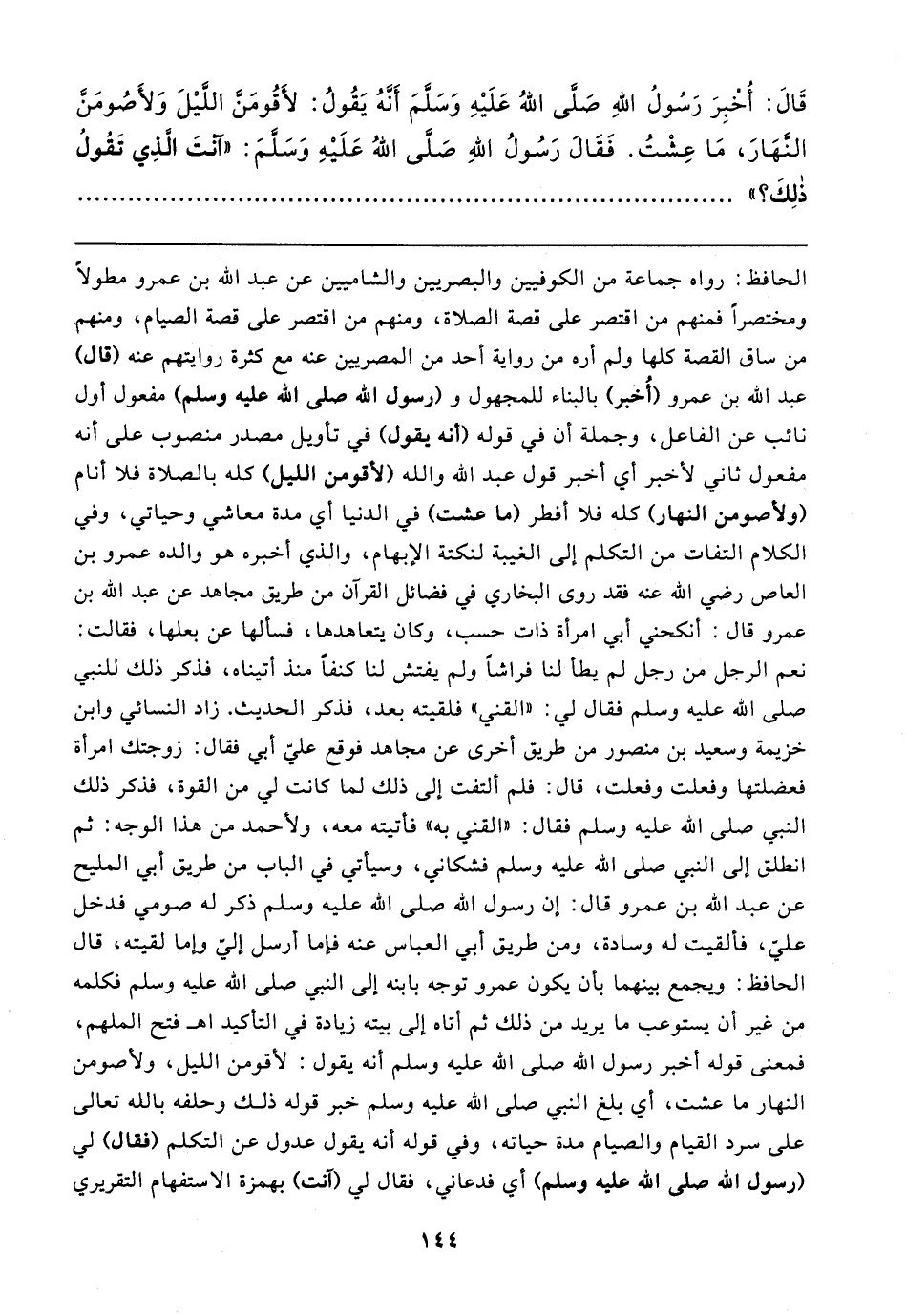 قَال: أُخْبِرَ رَسُولُ اللهِ صَلَّى اللهُ عَلَيهِ وَسَلَّمَ أَنَّهُ يَقُولُ: لأَقُومَنَّ اللَّيلَ وَلأَصُومَنَّ النَّهَارَ، مَا عِشْتُ. فَقَال رَسُولُ اللهِ صَلَّى اللهُ عَلَيهِ وَسَلَّمَ: "آنْتَ الذِي تَقُولُ ذلِكَ؟ "