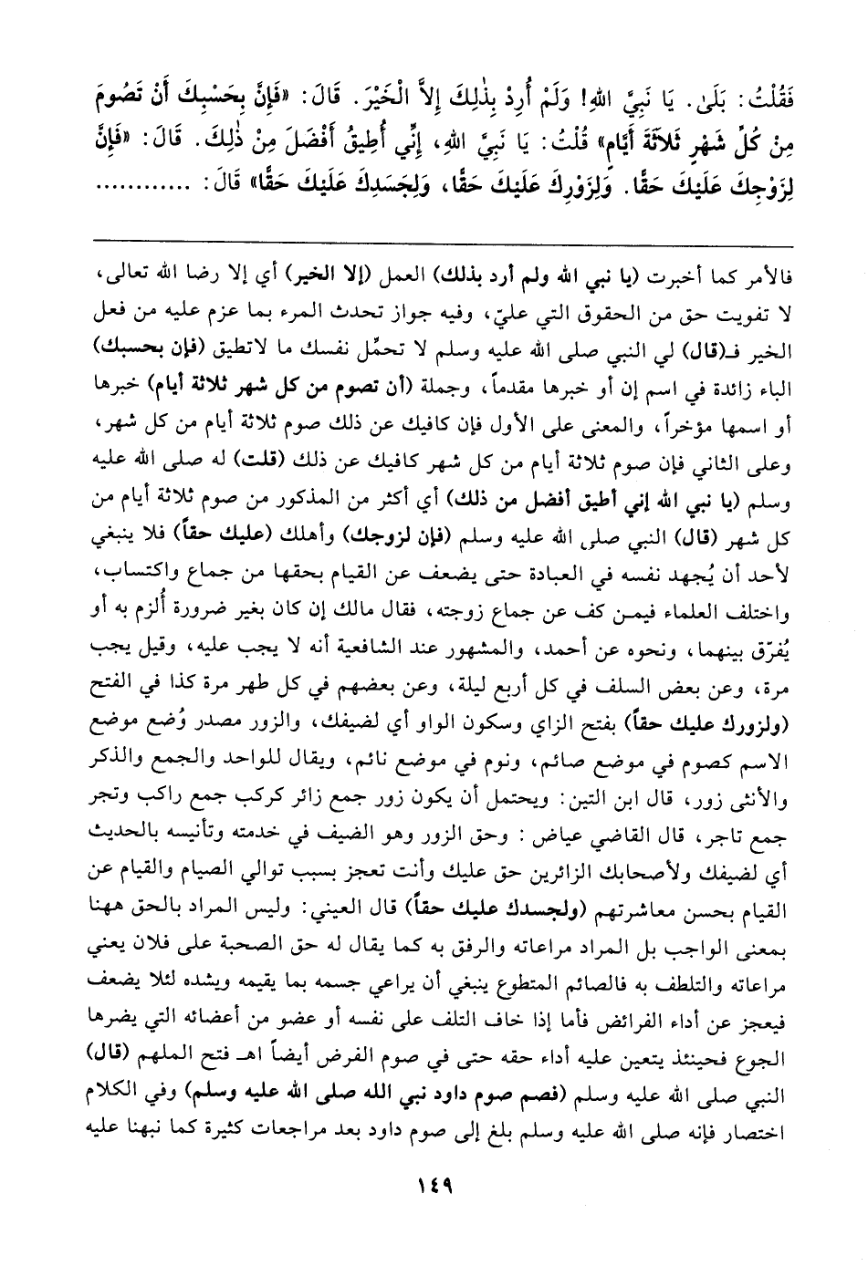 فَقُلْتُ: بَلَى. يَا نَبِيَّ اللهِ! وَلَمْ أُرِدْ بِذلِكَ إلا الْخَيرَ. قَال: "فَإِن بِحَسْبِكَ أَنْ تَصُومَ مِنْ كُلِّ شَهْرٍ ثَلاثةَ أَيَّامٍ" قُلْتُ: يَا نَبِيَّ اللهِ، إِنِّي أُطِيقُ أَفْضَلَ مِنْ ذلِكَ. قَال: "فَإِنَّ لِزَوْجِكَ عَلَيكَ حَقًّا. وَلِزَوْرِكَ عَلَيكَ حَقًّا، وَلِجَسَدِكَ عَلَيكَ حَقًّا" قَال: