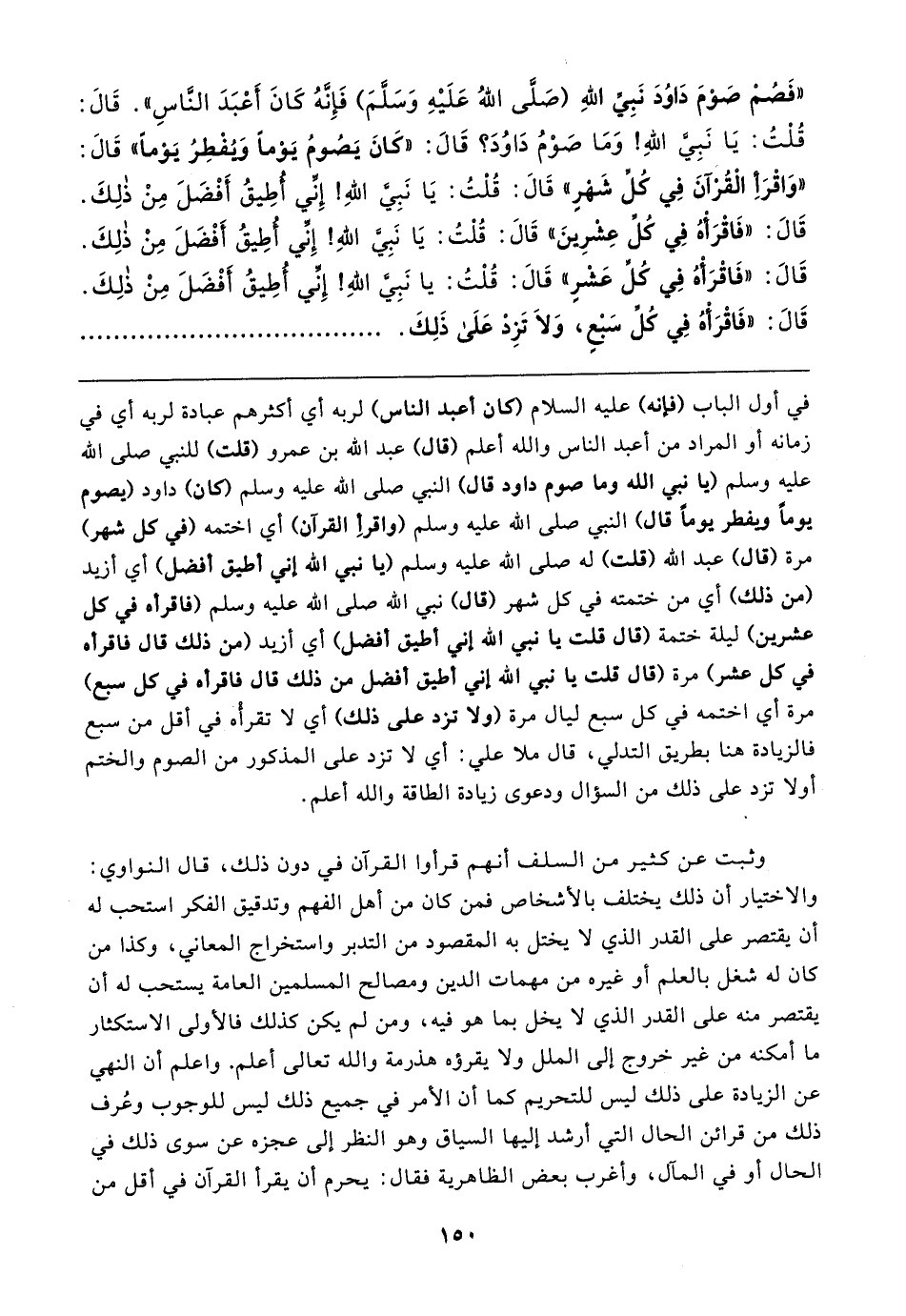 "فَصُمْ صَوْمَ دَاوُدَ نَبِيِّ اللهِ (صَلَّى اللهُ عَلَيهِ وَسَلَّمَ) فَإِنَّهُ كَانَ أَعْبَدَ النَّاسِ". قَال: قُلْتُ: يَا نَبِيَّ اللهِ! وَمَا صَوْمُ دَاوُدَ؟ قَال: "كَانَ يَصُومُ يَوْما وَيُفْطِرُ يَوْمًا" قَال: "وَاقْرَأ الْقُرْآنَ فِي كُل شَهْرٍ" قَال: قُلْتُ: يَا نَبِيَّ اللهِ! إِنِّي أُطِيقُ أَفْضَلَ مِنْ ذلِكَ. قَال: "فَاقْرَأْهُ فِي كُل عِشْرِينَ" قَال: قُلْتُ: يَا نَبِي اللهِ! إِنِّي أُطِيقُ أَفْضَلَ مِنْ ذلِكَ. قَال: "فَاقْرَأْهُ فِي كُلِّ عَشرٍ" قَال: قُلْتُ: يا نَبِيَّ اللهِ! إِنِّي أُطِيقُ أَفْضَلَ مِنْ ذلِكَ. قَال: "فَاقْرَأْهُ فِي كُل سَبعٍ، وَلَا تَزِدْ عَلَى ذَلِكَ