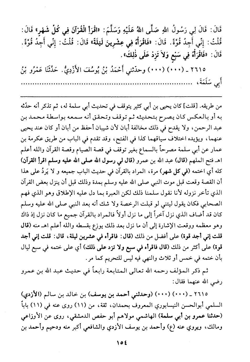 قَال: قَال لِي رَسُولُ اللهِ صَلَّى اللهُ عَلَيهِ وَسَلَّمَ: لا اقْرَأ الْقُرْآنَ فِي كُل شَهْرٍ" قَال: قُلْتُ: إِنِّي أجِدُ قُوَّة. قَال: "فَاقْرَأْهُ فِي عِشرِينَ لَيلَةً" قَال: قُلْتُ: إِني أَجِدُ قُوَّةً. قَال: "فَاقْرَأْهُ فِي سَبْعٍ وَلَا تَزِدْ عَلَى ذلِكَ".