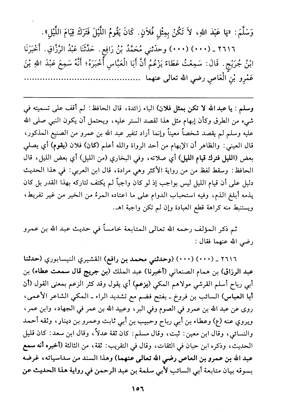 وَسَلَّمَ: "يَا عَبْدَ اللهِ، لَا تَكُنْ بِمِثْلِ فُلانٍ. كَانَ يَقُومُ الليلَ فَتَرَكَ قِيَامَ اللَّيلِ".