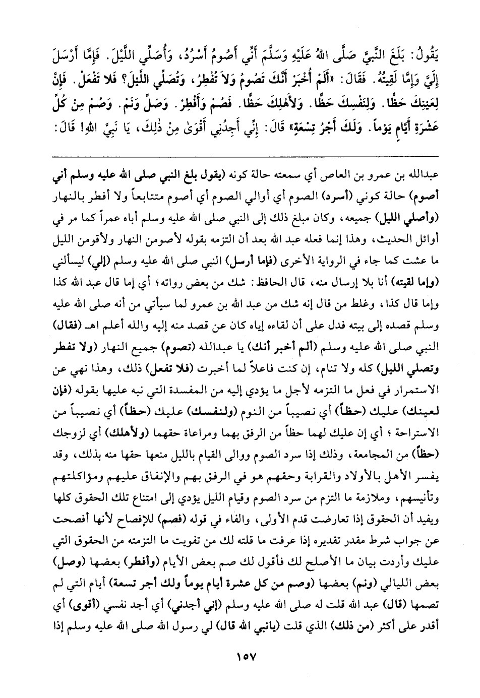 يَقُولُ: بَلَغَ النَّبيَّ صَلَّى اللهُ عَلَيهِ وَسَلَّمَ أَنِّي أصُومُ أَسْرُدُ، وَأُصَلِّي اللَّيلَ. فَإِمَّا أَرْسَلَ إِلَيَّ وَإِمَّا لَقِيتُهُ. فَقَال: "أَلَمْ أُخْبَرْ أَنَّكَ تَصُومُ وَلَا تُفْطِرُ، وَتُصَلِّي اللَّيلَ؟ فَلا تَفْعَلْ. فَإنَّ لِعَينِكَ حَظًّا. وَلِنَفْسِكَ حَطًّا. وَلأَهْلِكَ حَظًّا. فَصُمْ وَأَفْطِرْ. وَصَلِّ وَنَمْ. وَصُمْ مِنْ كُلِّ عَشْرَةِ أَيَّامٍ يَوْمًا. وَلَكَ أَجْرُ تِسْعَةٍ" قَال: إِنِّي أَجِدُنِي أَقْوَى مِنْ ذلِكَ، يَا نَبِيَّ اللهِ! قَال:
